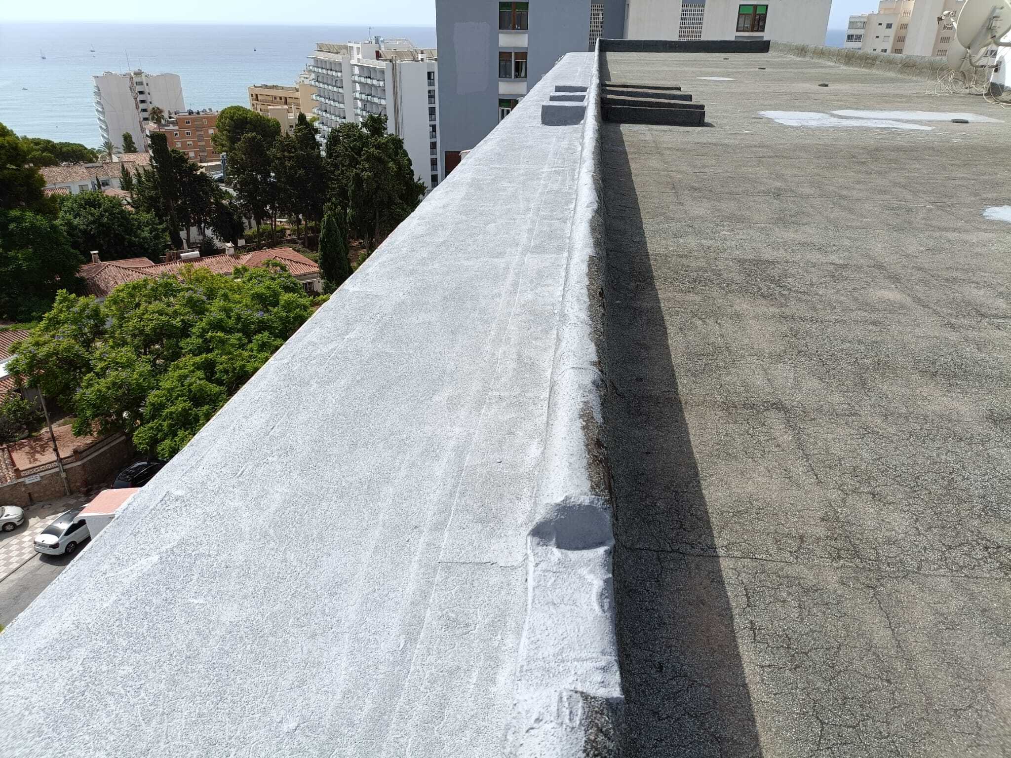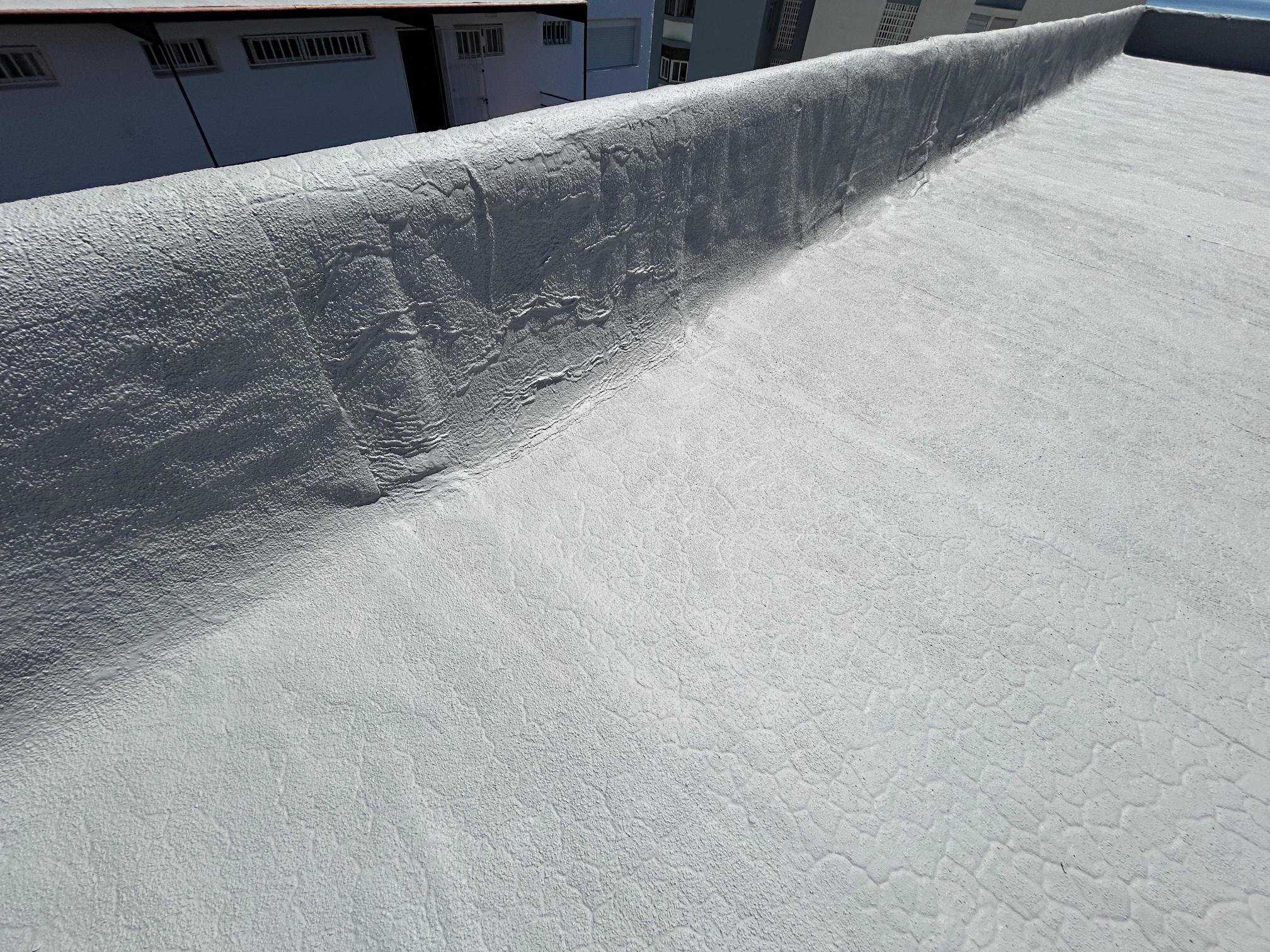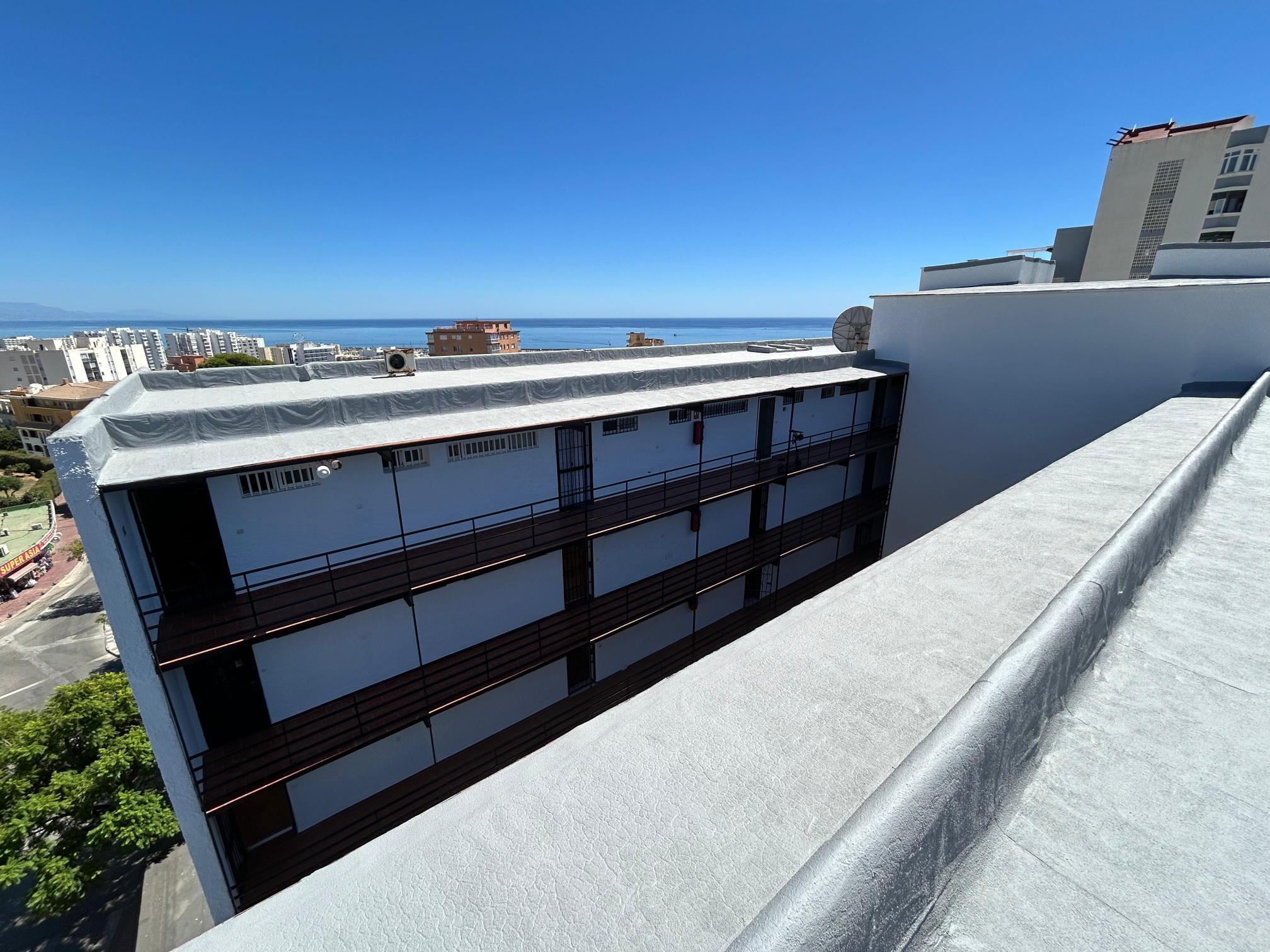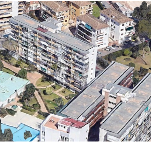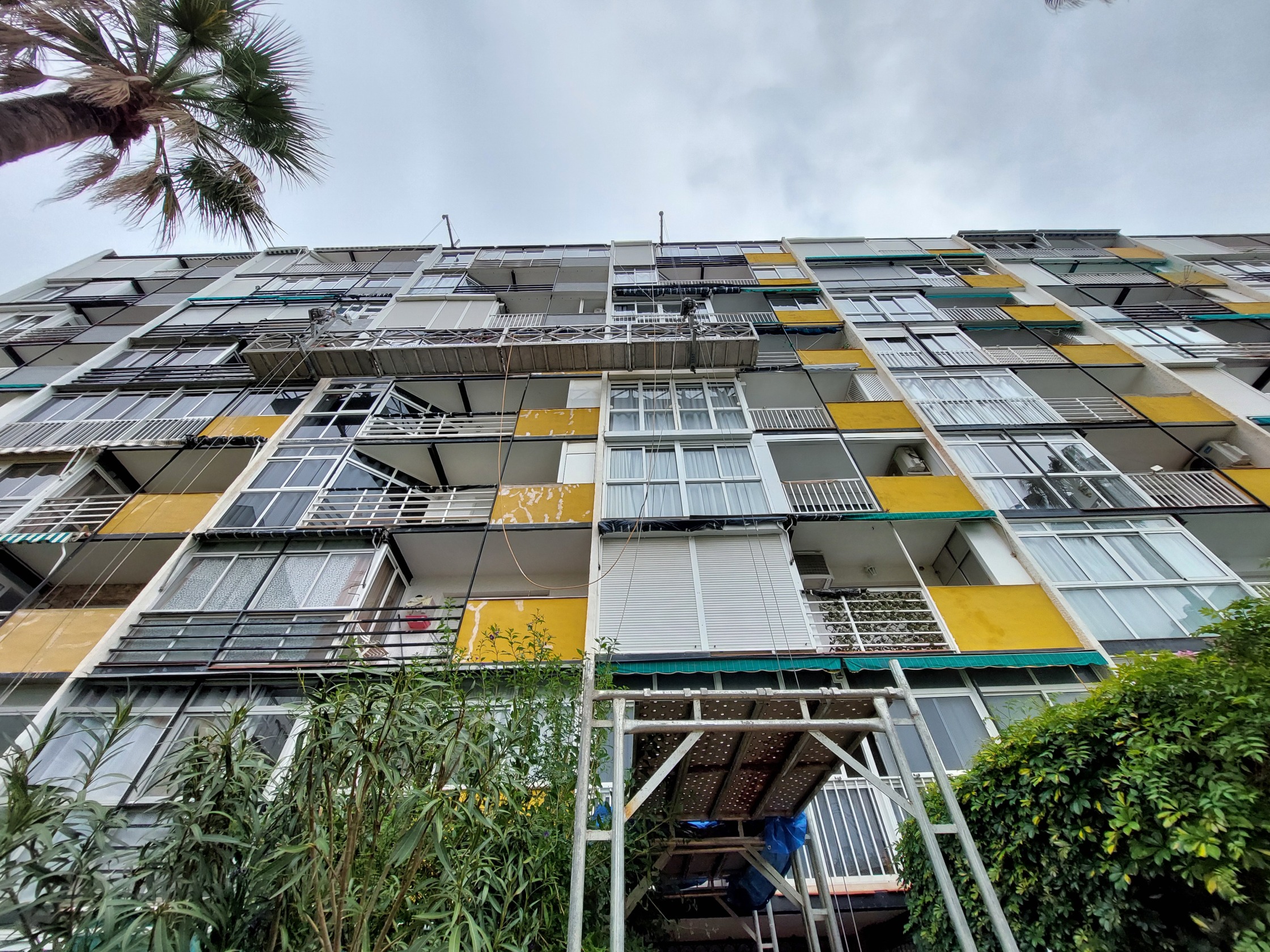 Mediante Prescripción de PROCOLOR y la DF, se realiza esta rehabilitación, Integral de Paramentos exteriores Hidrolimpieza, saneado de Fisuras, con masillas fibradas, pasivación de Forjados, recuperación de volúmenes con Morteros fibrados, PROCOFIX, y 2 manos de PROCOTEX LISO B.MED, en techos de hormigón, ACRILFIX y 2 Manos de PROCOTEX EXTRALISO B.MED, Ladrillo visto, DIQUE FLUIDO HIDROFUGANTE a saturación, elementos férricos con PROCOFER EXP BR NEGRO, zonas comunes interior COMODIN y en cubiertas, Sistema DIQUE MEMBRANA POL; BLANCO.