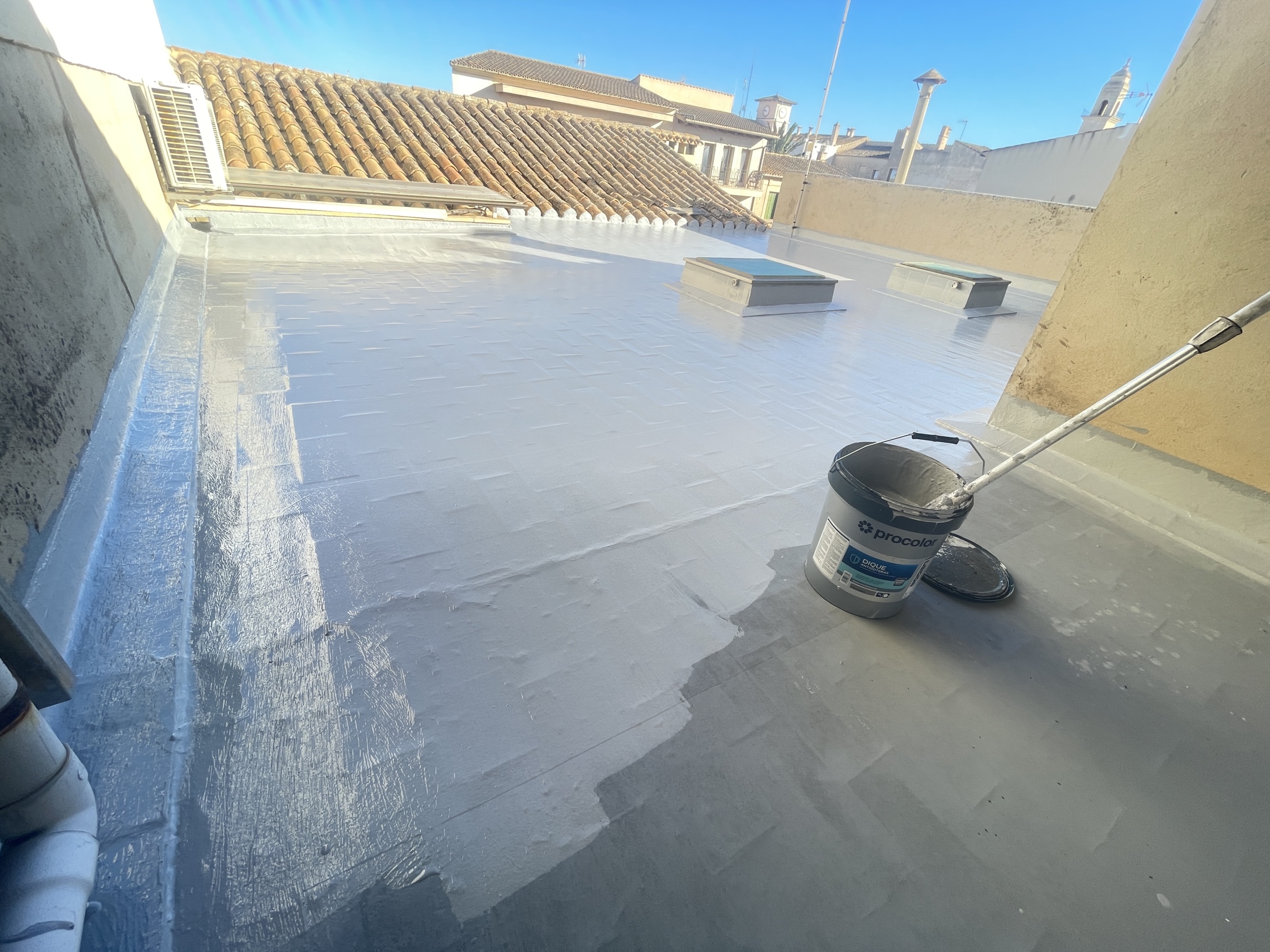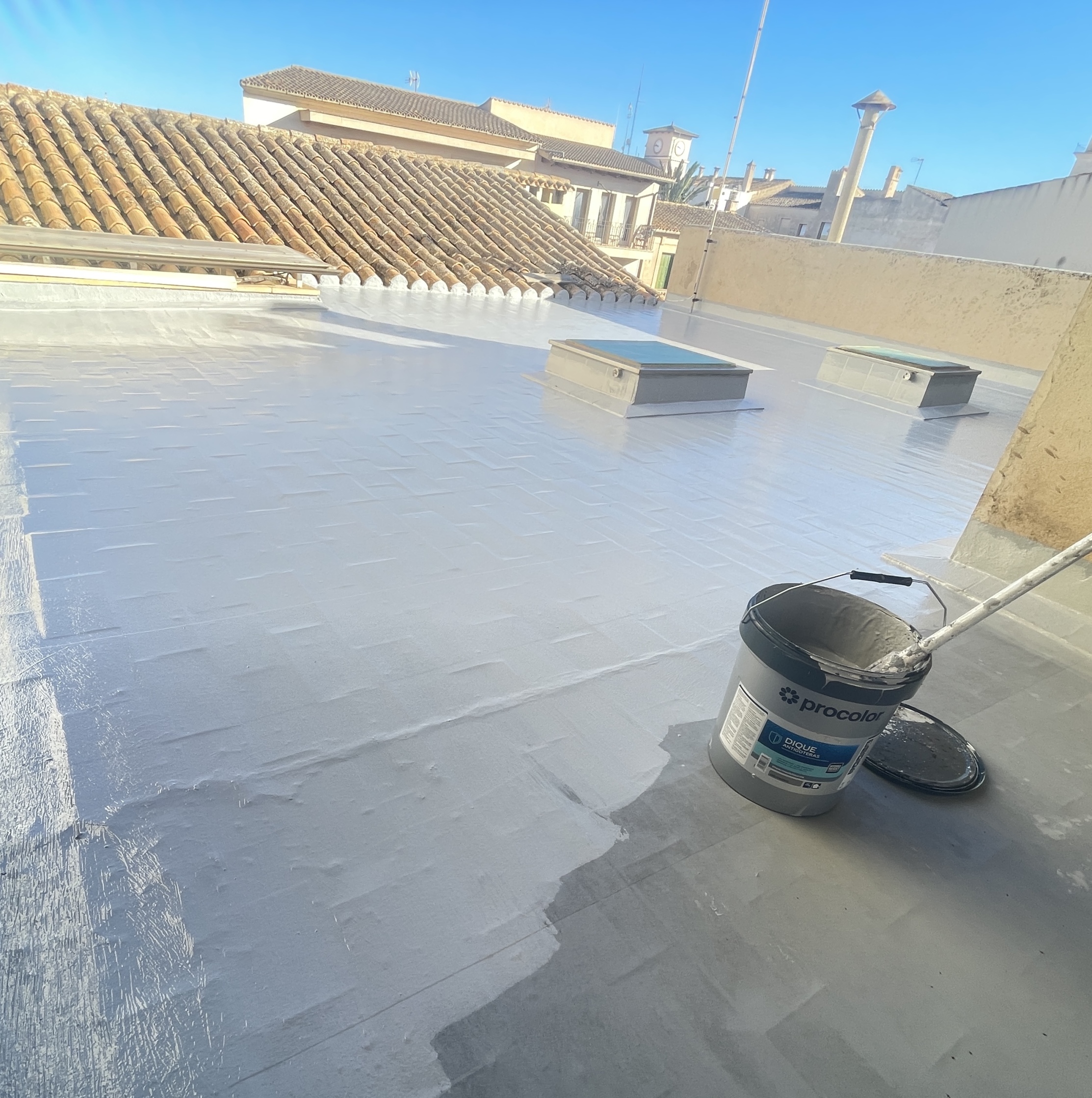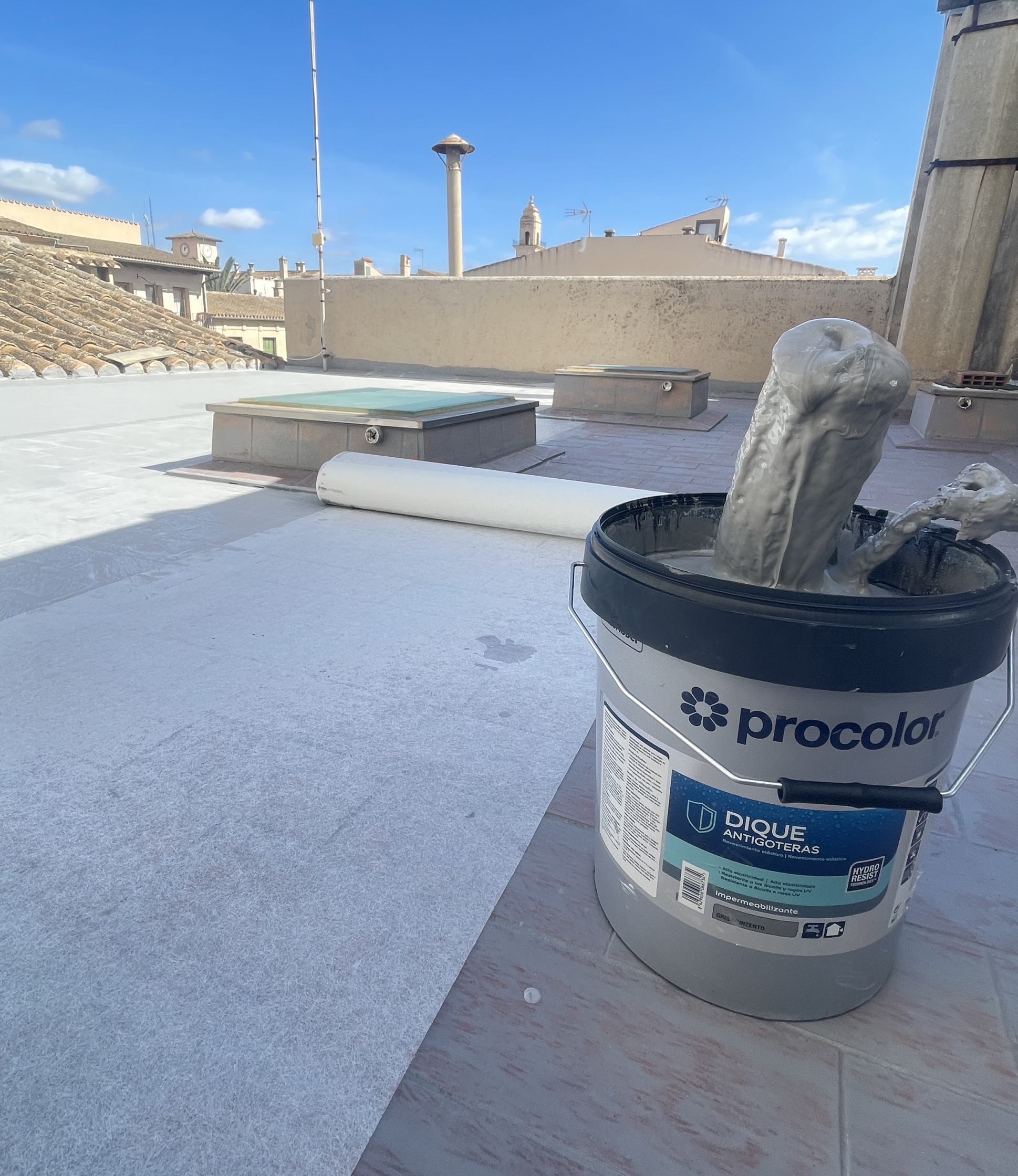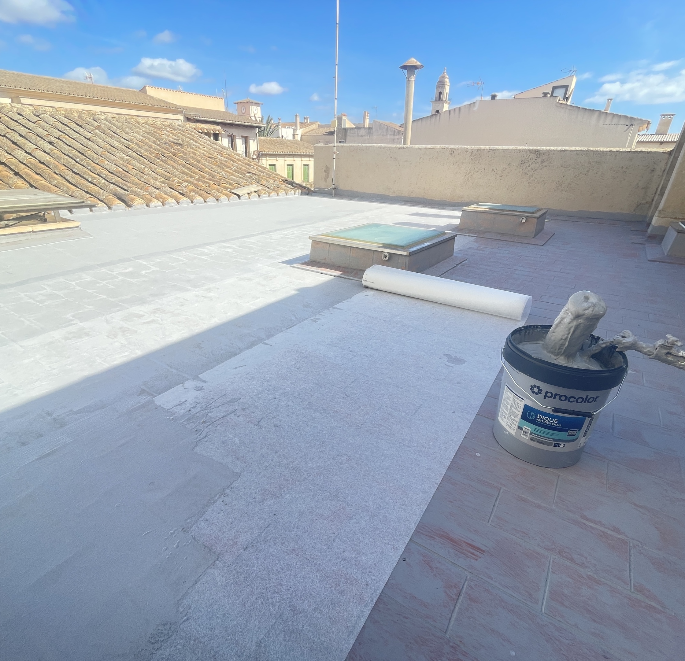 Limpieza de terraza y aplicacion de una mano de dique antigoteras y posterior colocaccion de mala de fibra de vidrio con posterior acabado con 3 manos de dique antigoteras