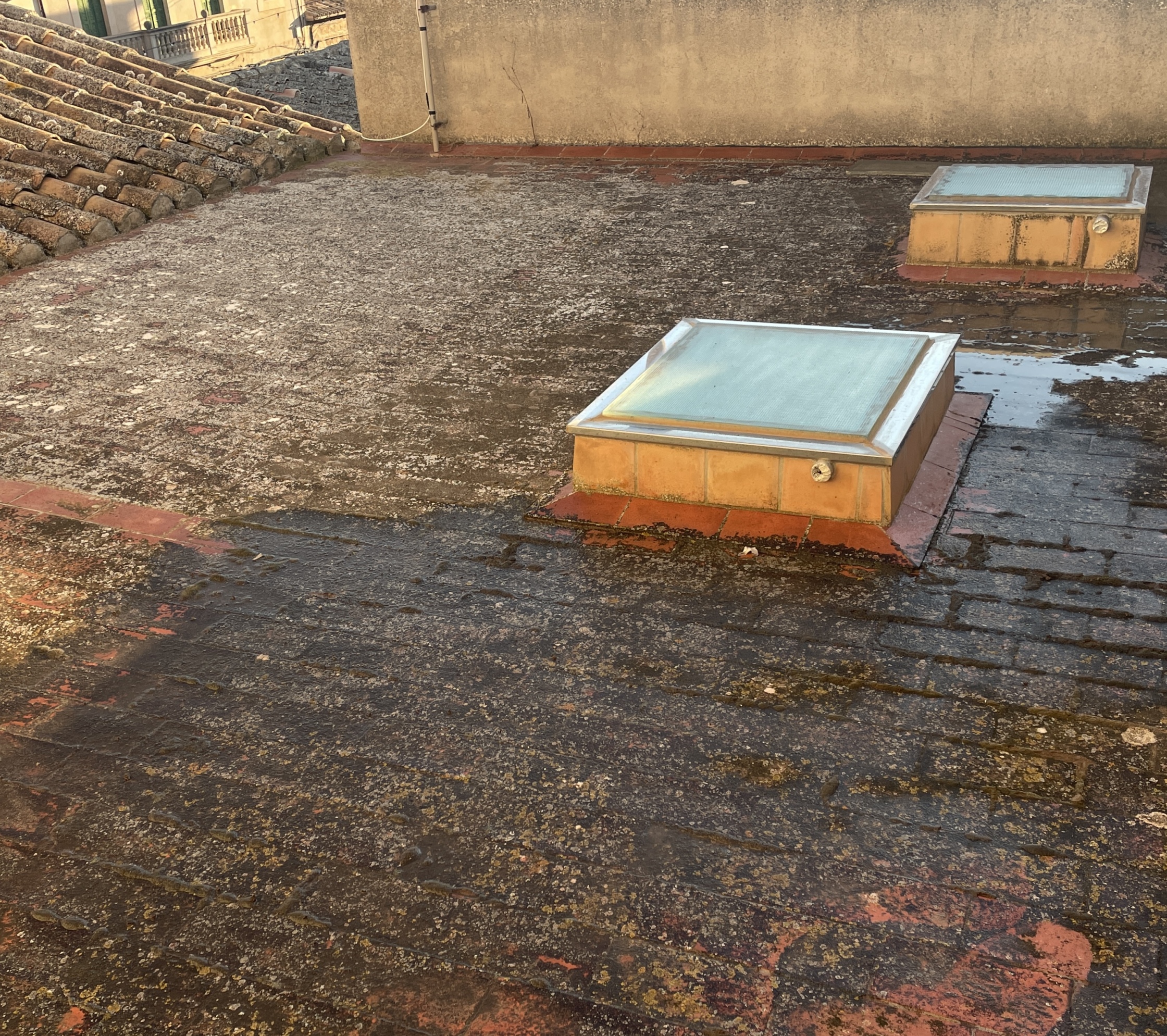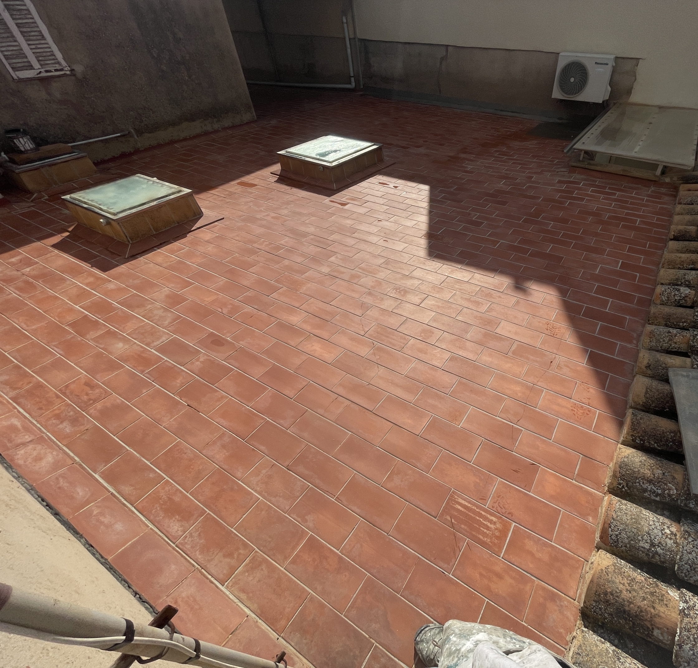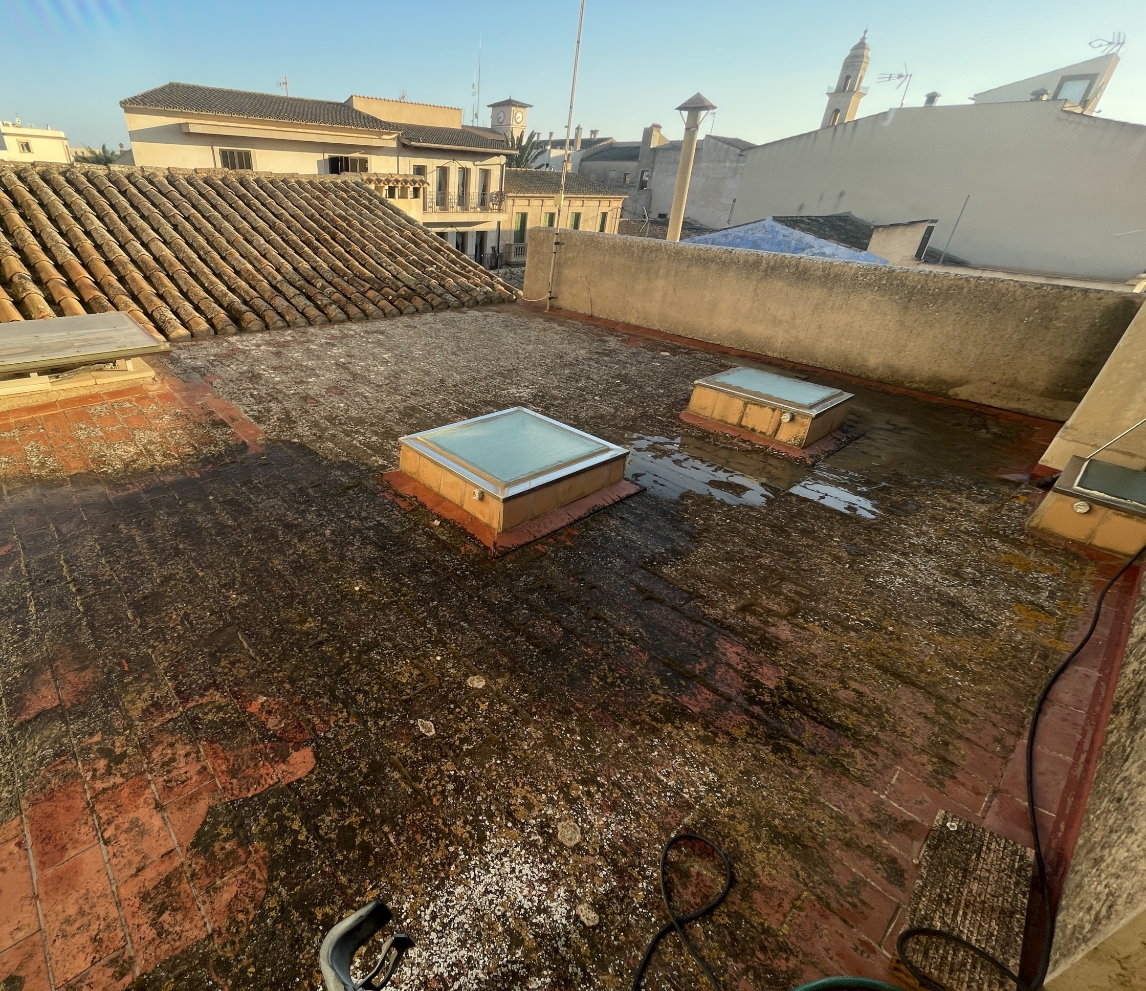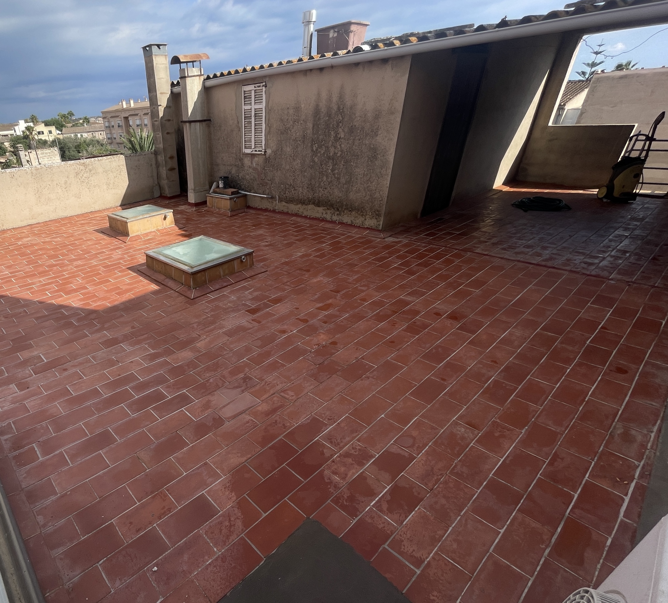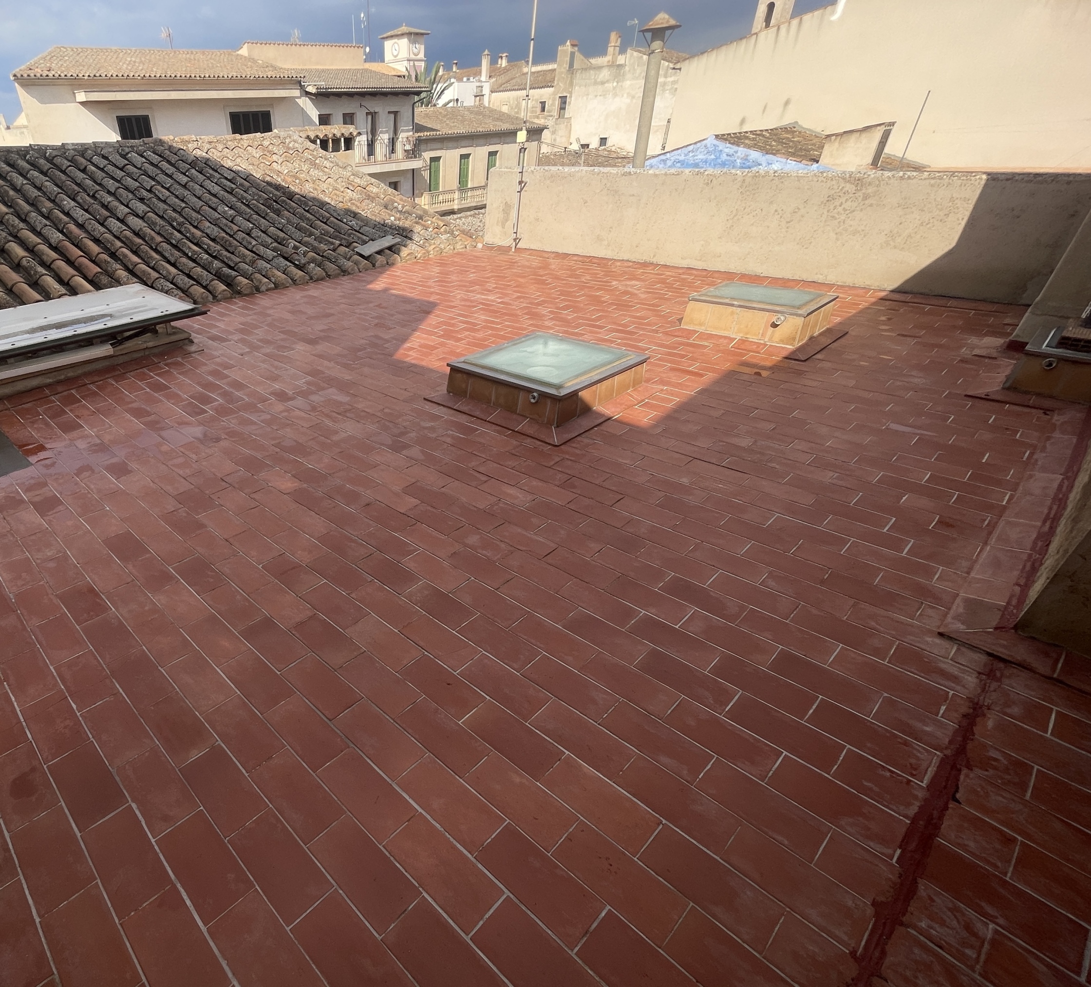 Limpieza de terraza y aplicacion de una mano de dique antigoteras y posterior colocaccion de mala de fibra de vidrio con posterior acabado con 3 manos de dique antigoteras