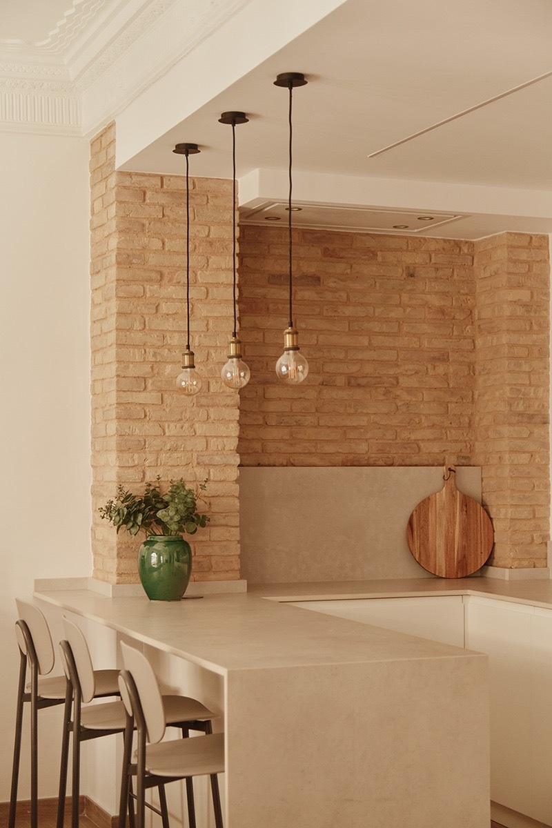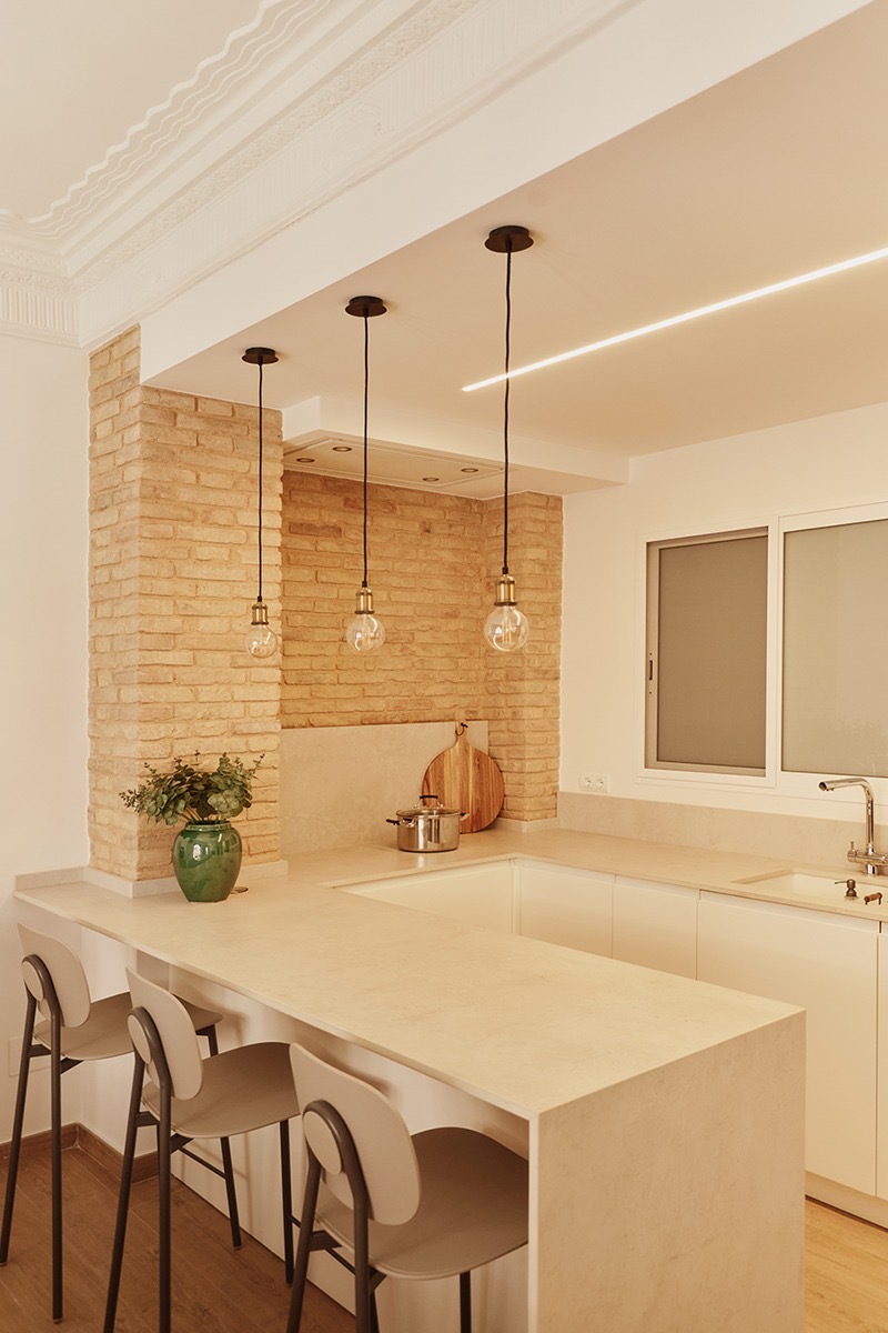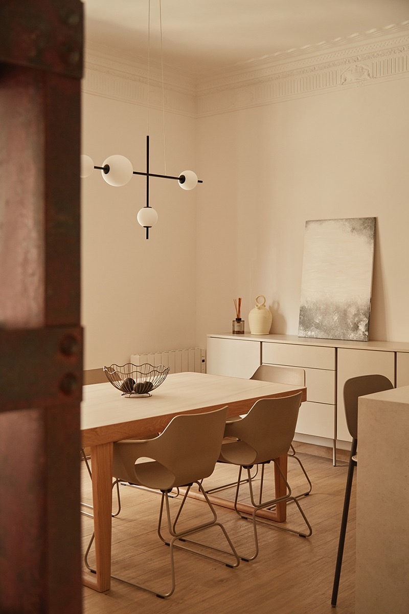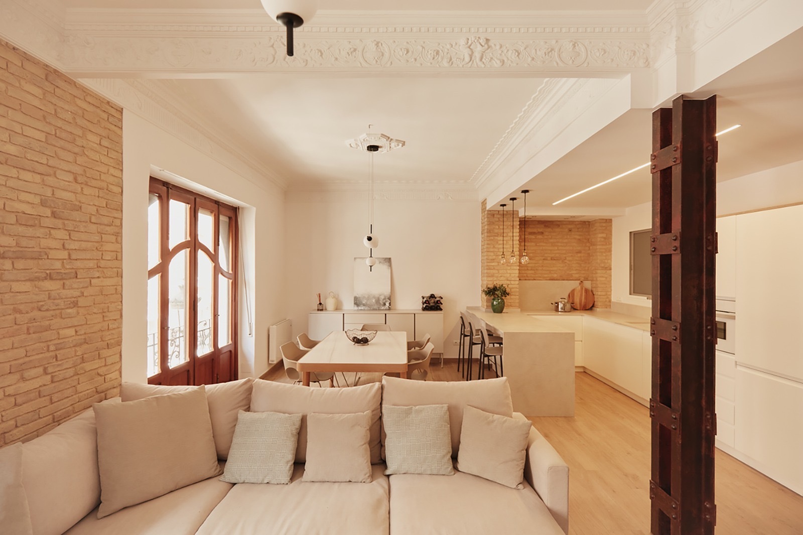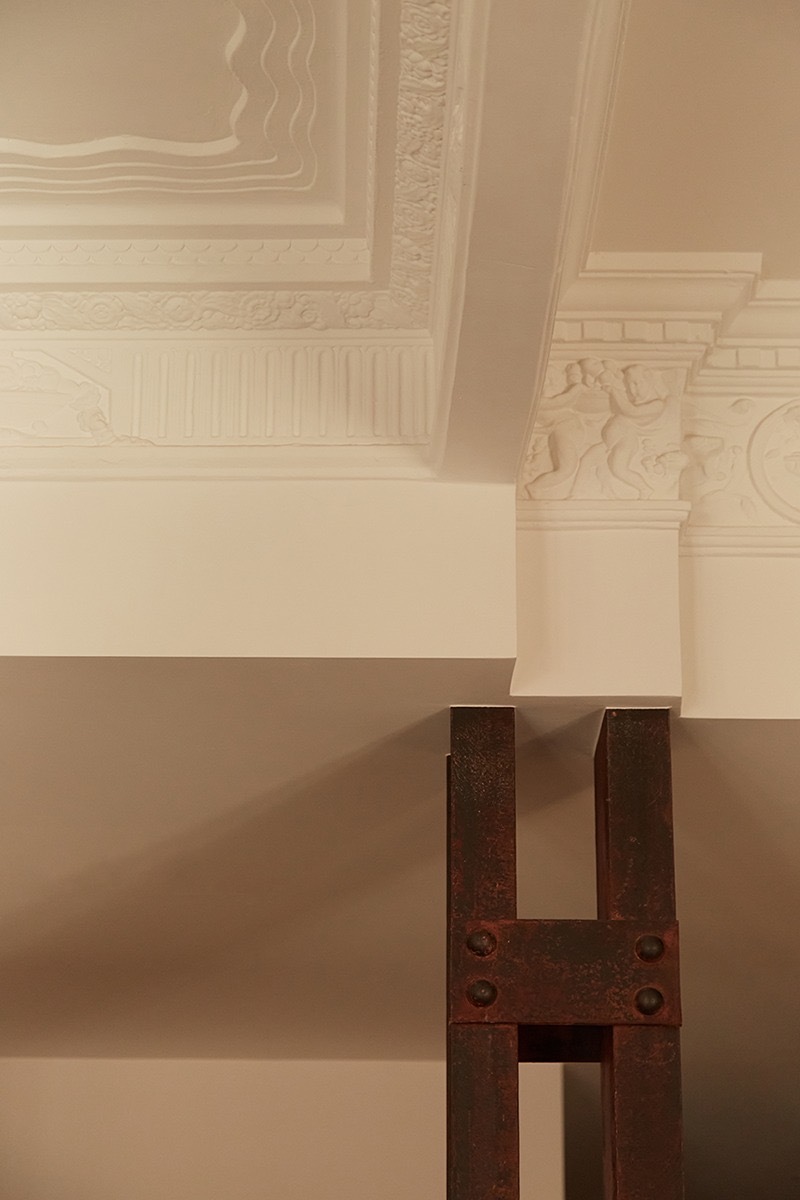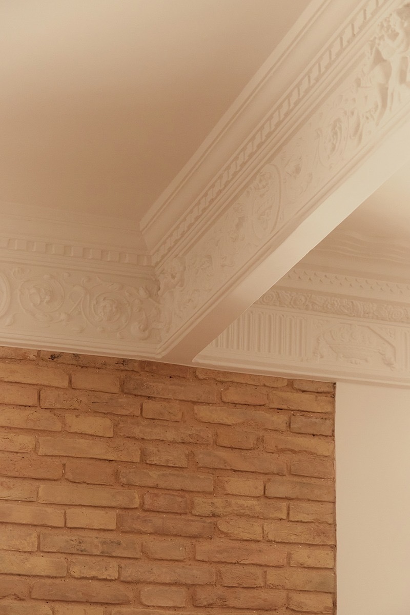 las molduras de escayola clásicas en los techos ,y recuperar un pilar de hierro remachado que estaba oculto bajo un revestimiento de yeso en mal estado.