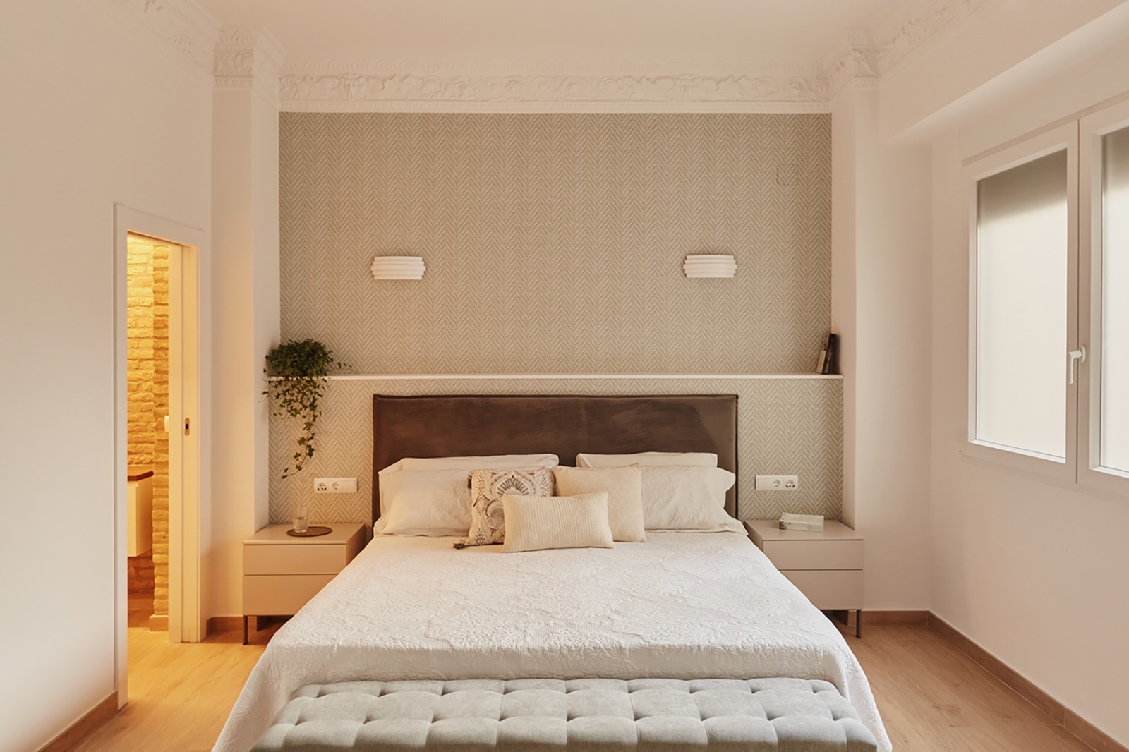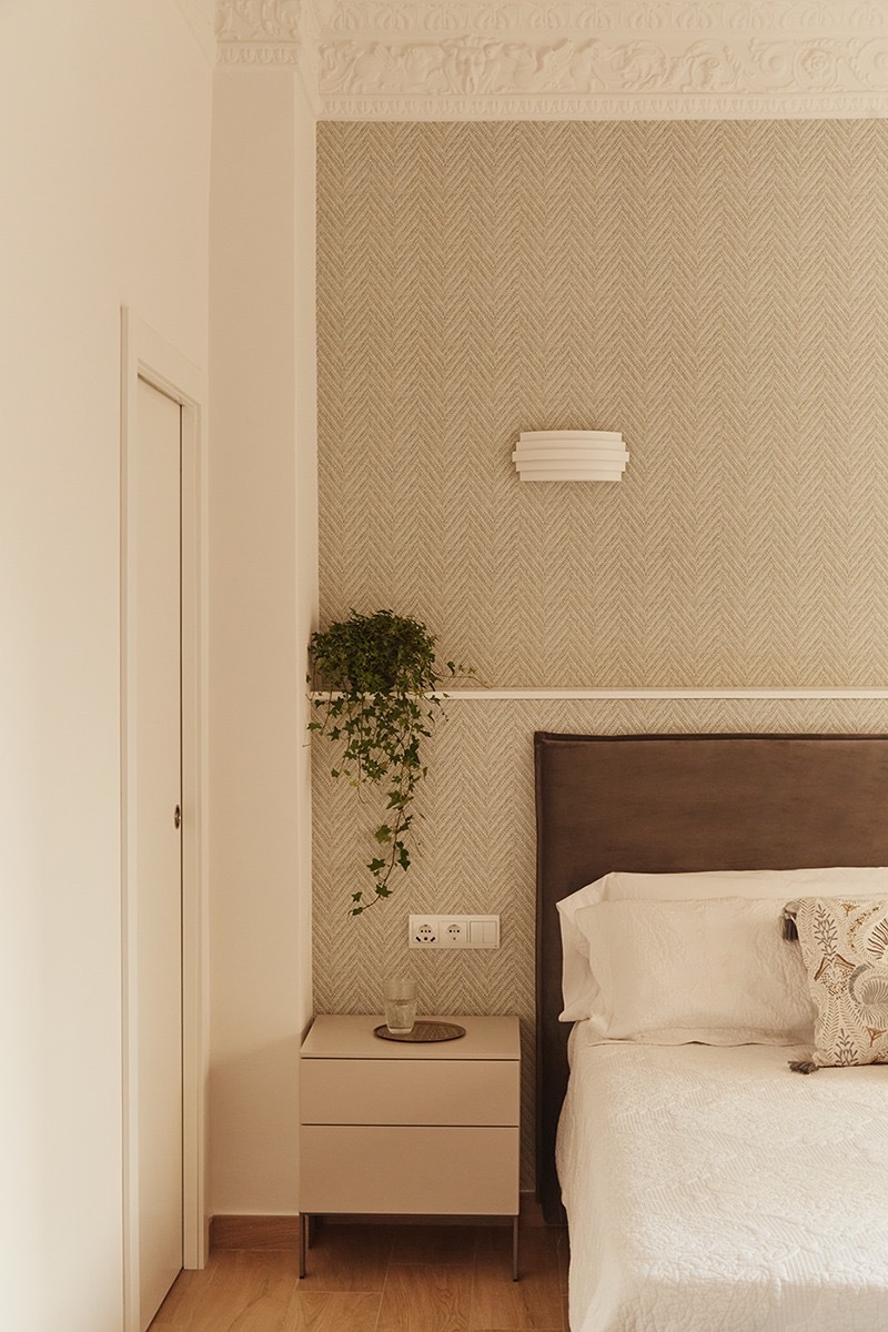 -Recuperación y pintura de techos ,molduras antiguos y colocación de papel en habitación principal :