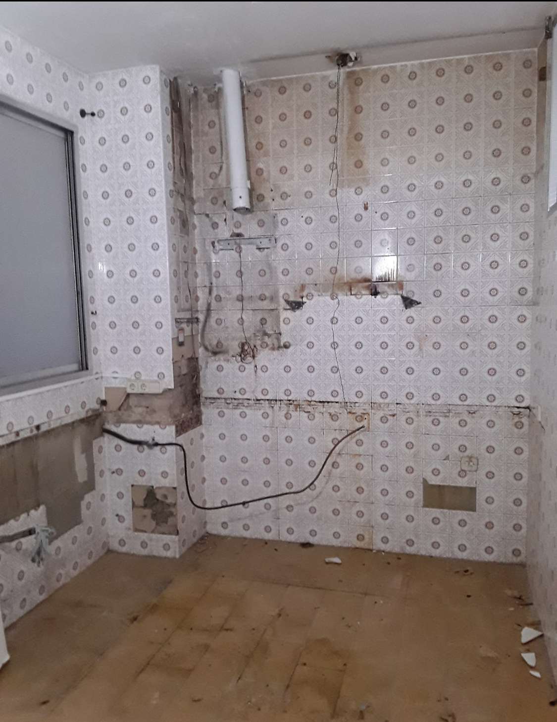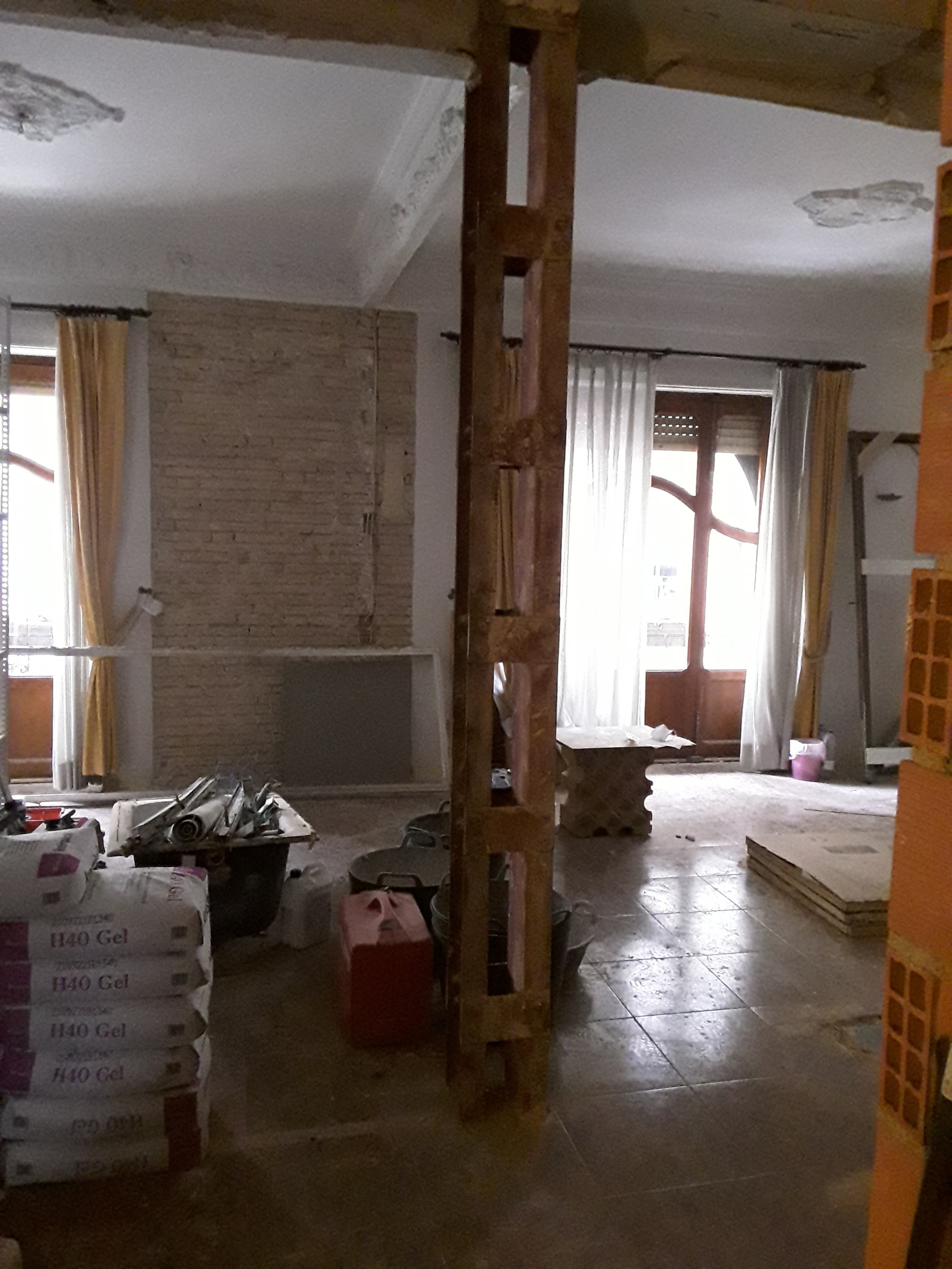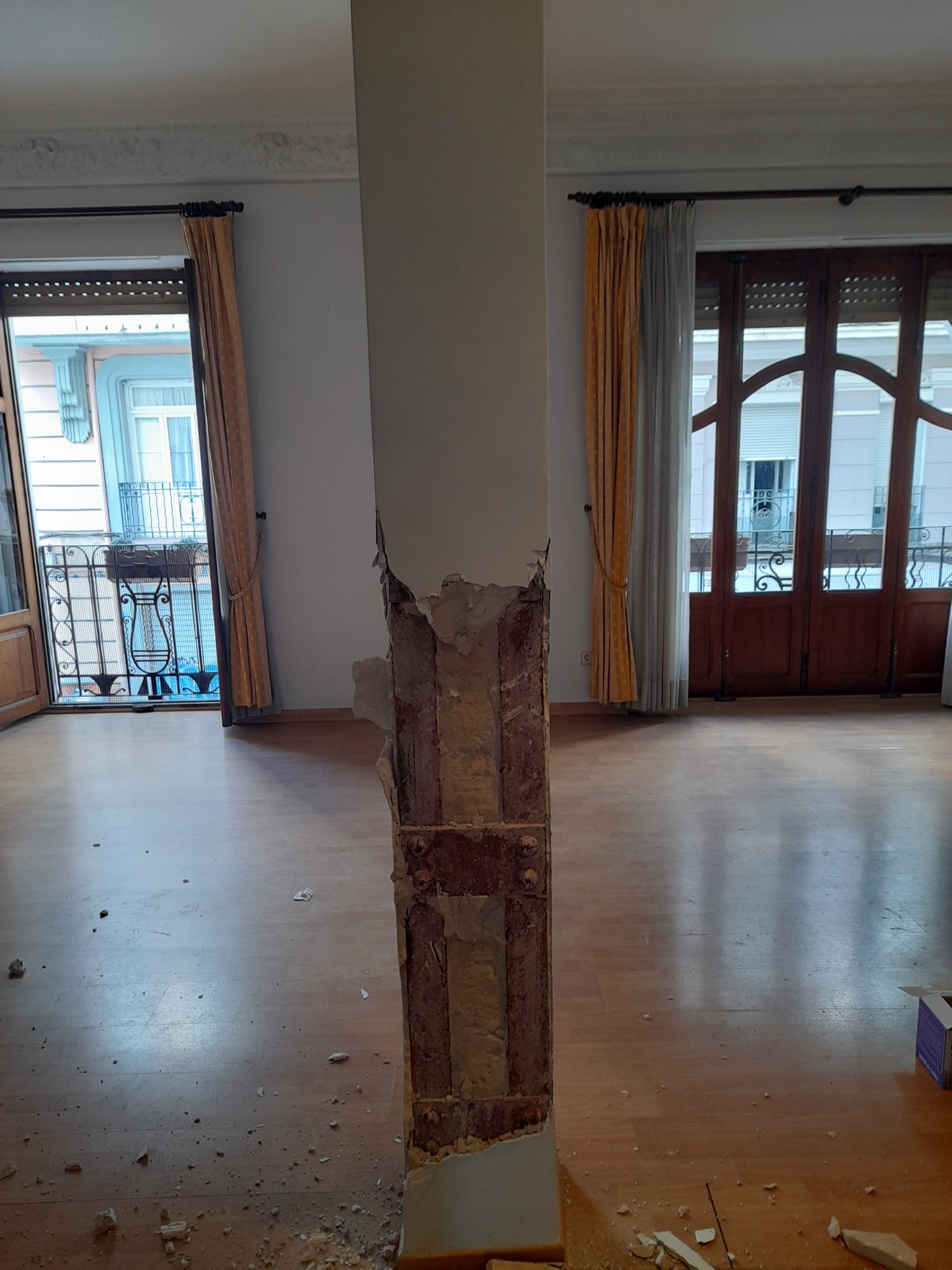 El pilar central se encontraba oculto tras un cajón de obra. Tras la demolición del revestimiento, nos encontramos con una viga de hierro antigua con signos de oxidación superficial.