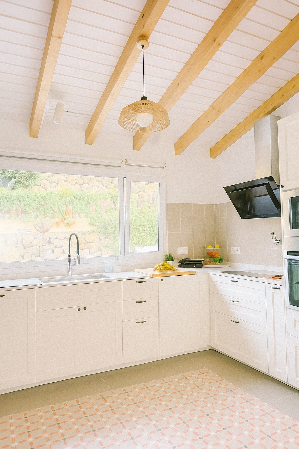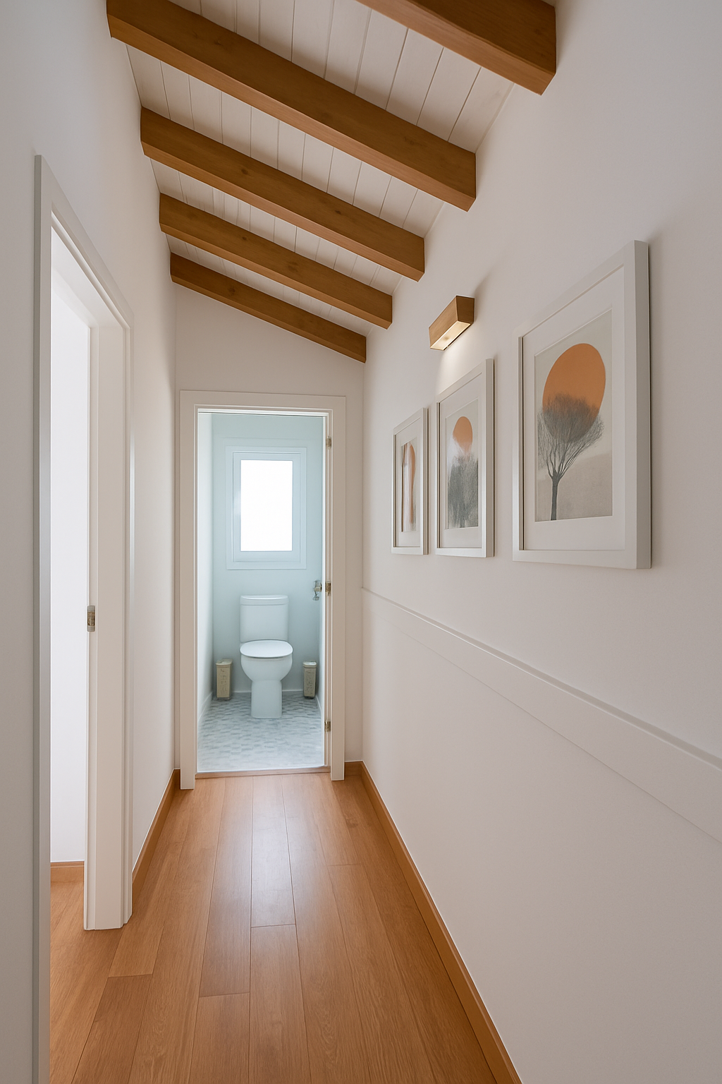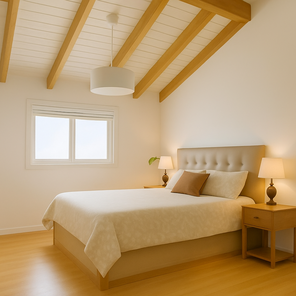 Machihembrados de madera, pintadas con lasures al agua Cetol Bl Naturals color blanco y viguetas Cetol Bl Naturals color