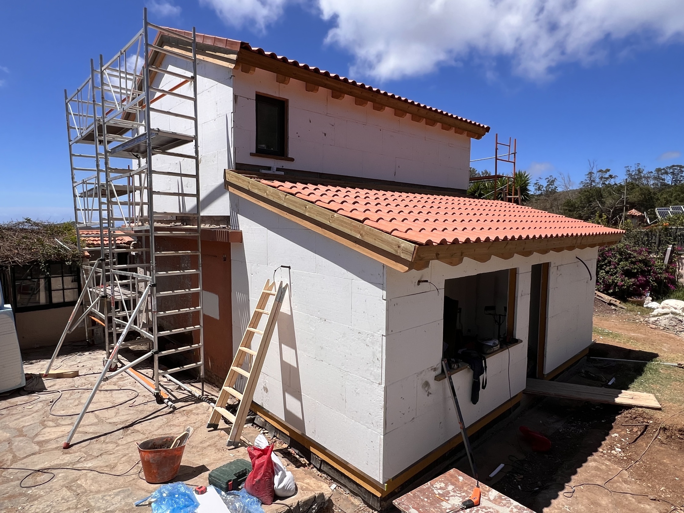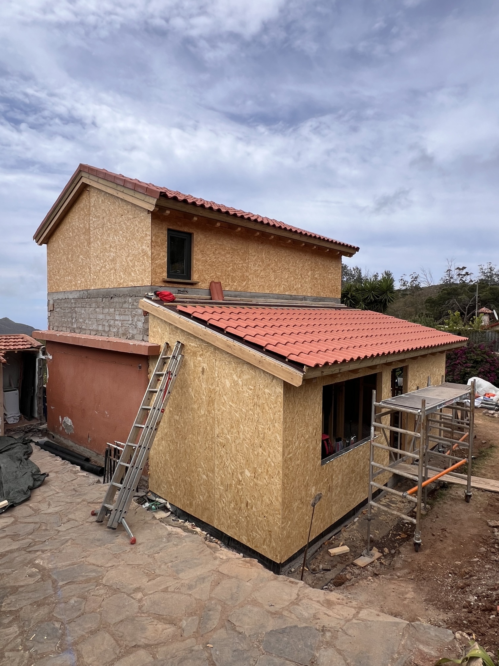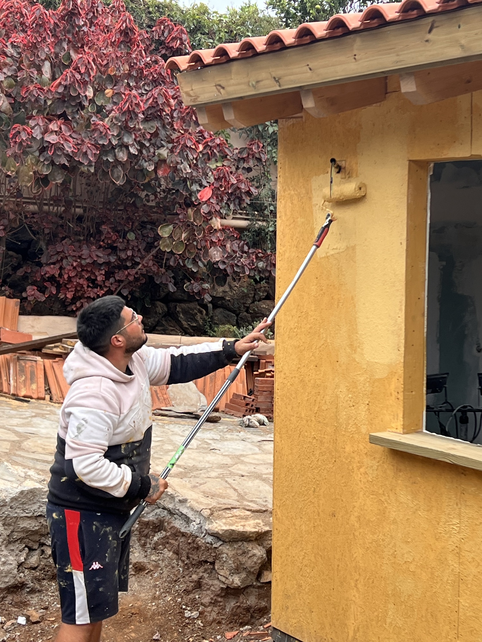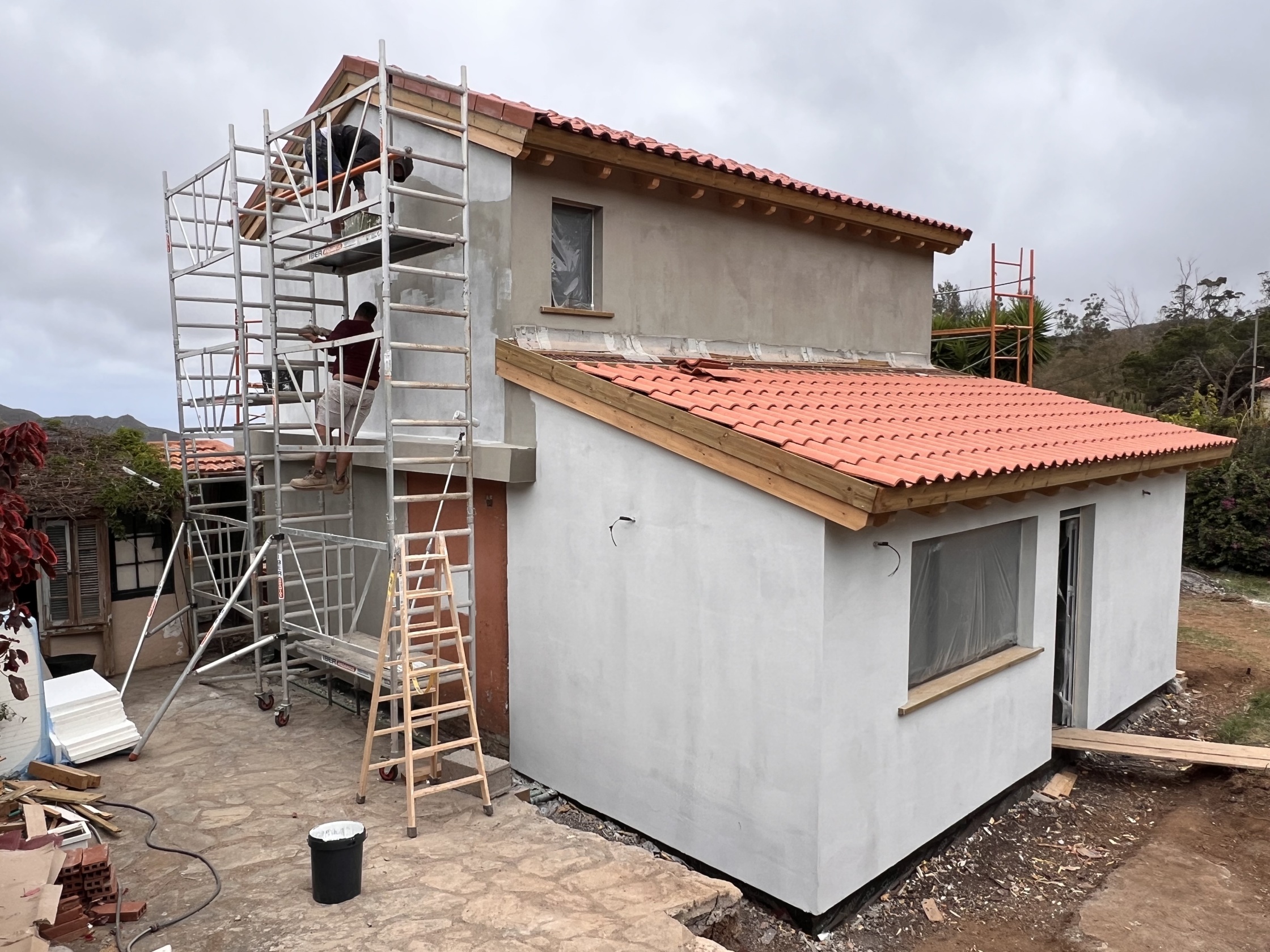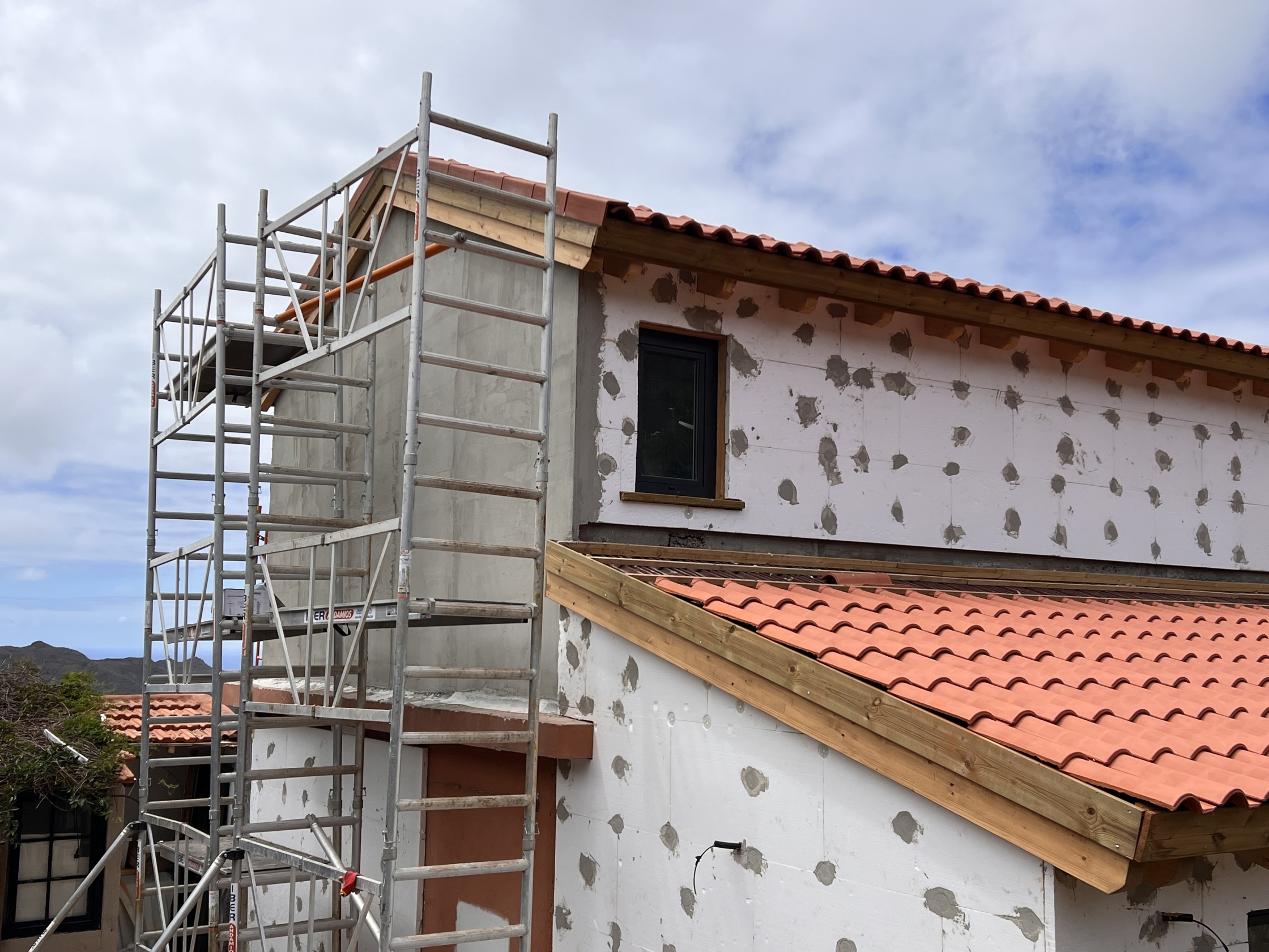 Desde la entrega de una construcción minima de mampostería se agregó una construccion de madera en planta alta y una lateral en planta baja, todo unido exteriormente con un revestimiento de SATE, unificando todas las superficies, utilizando además de productos WEBER, Fondo Renocatherm imprimación