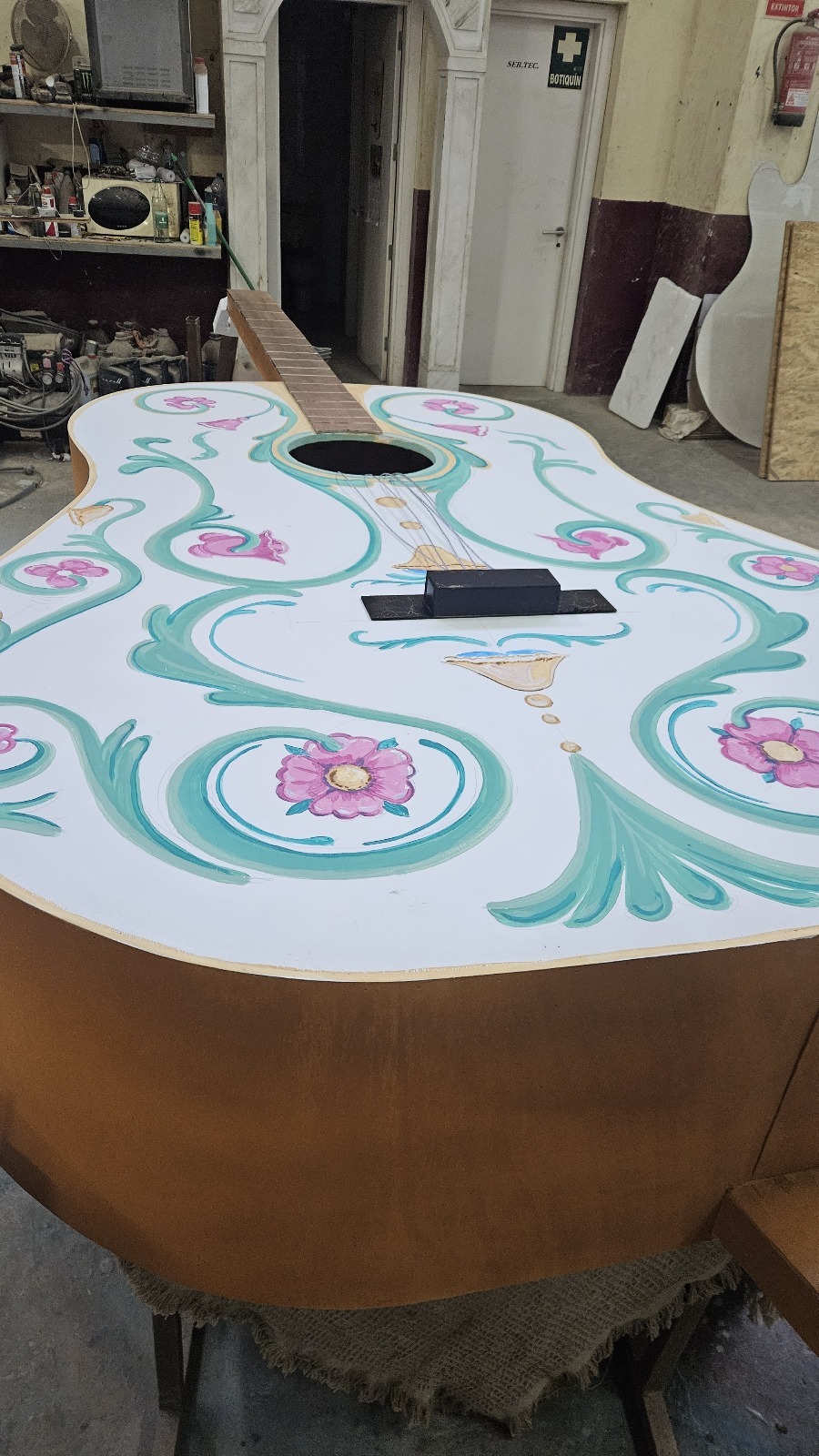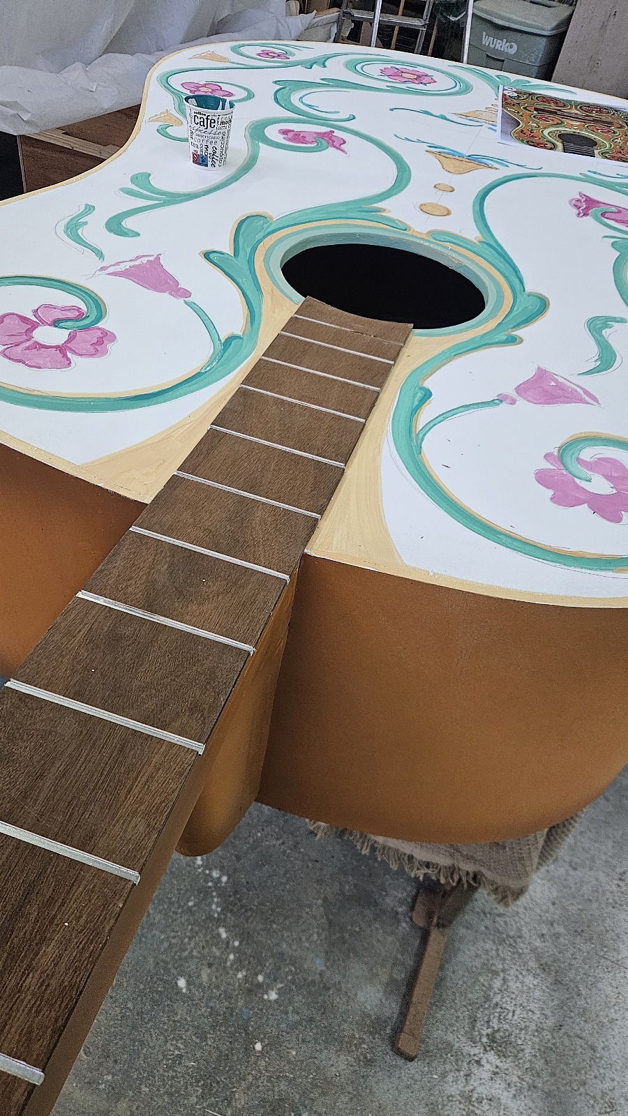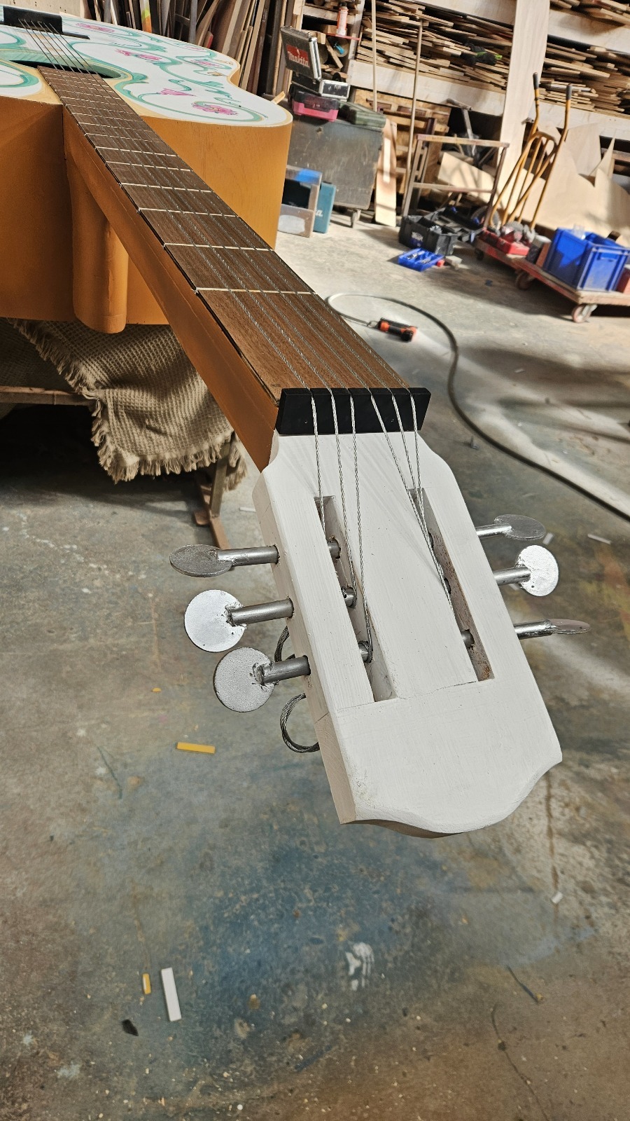 Creación de una carroza flamenca con una gran guitarra de madera y pintada con Esmate al Agua Acritec.