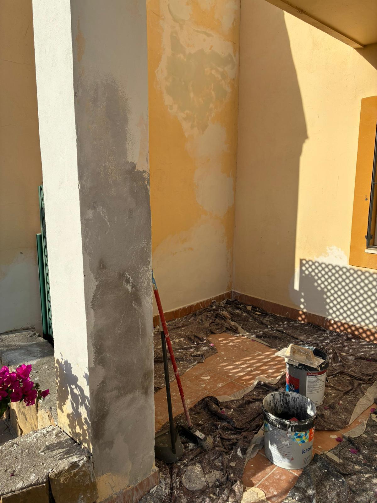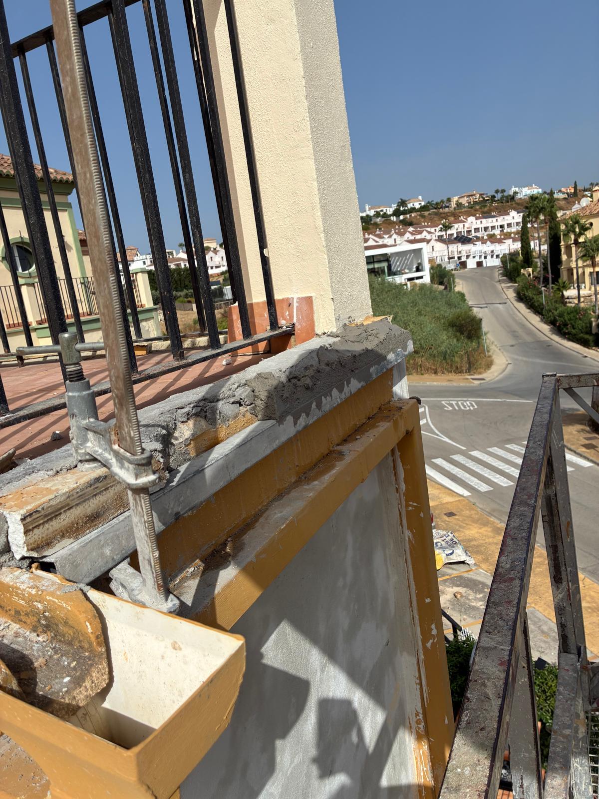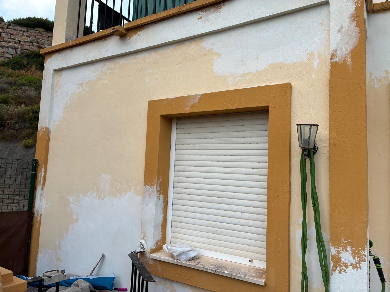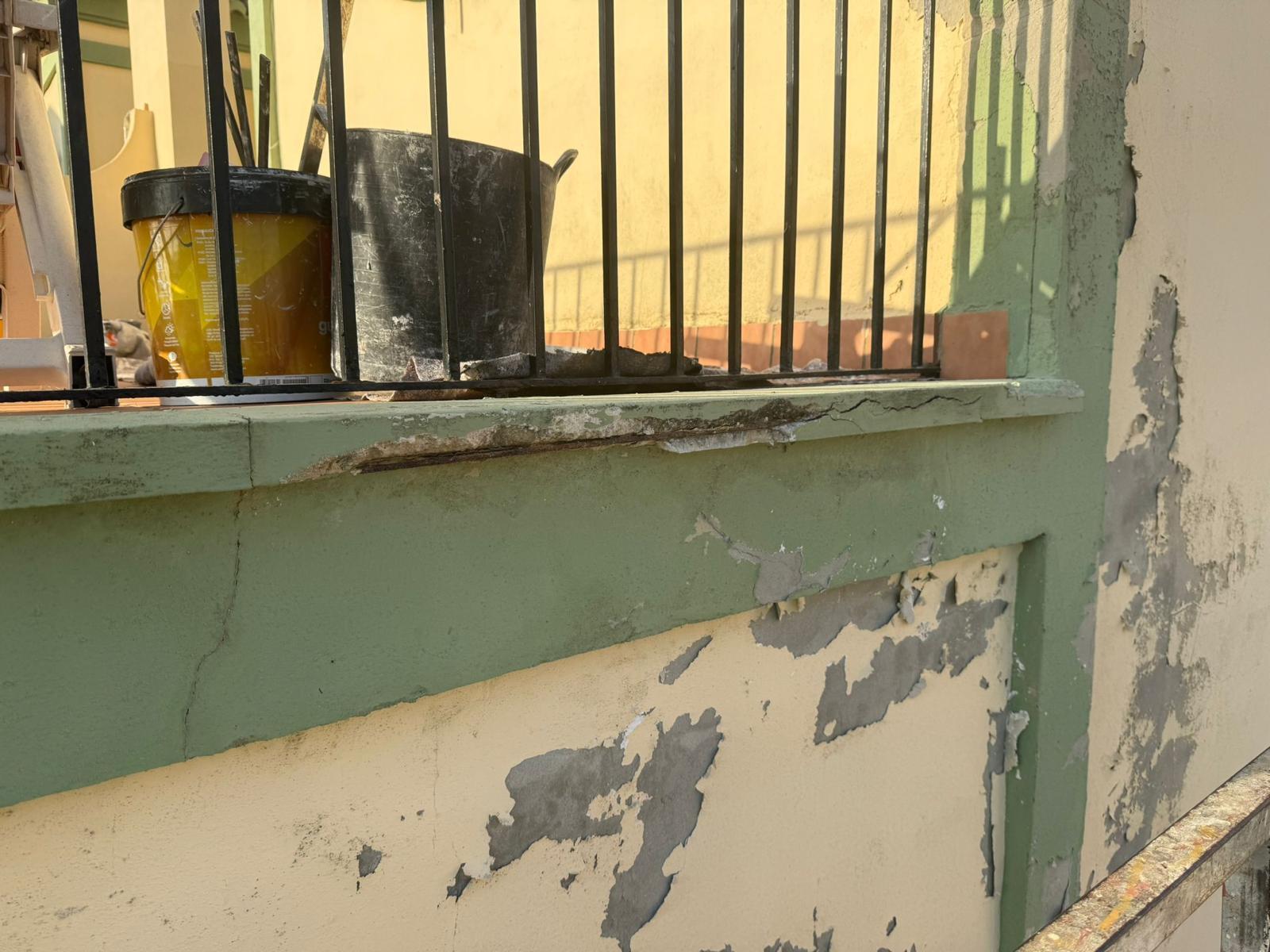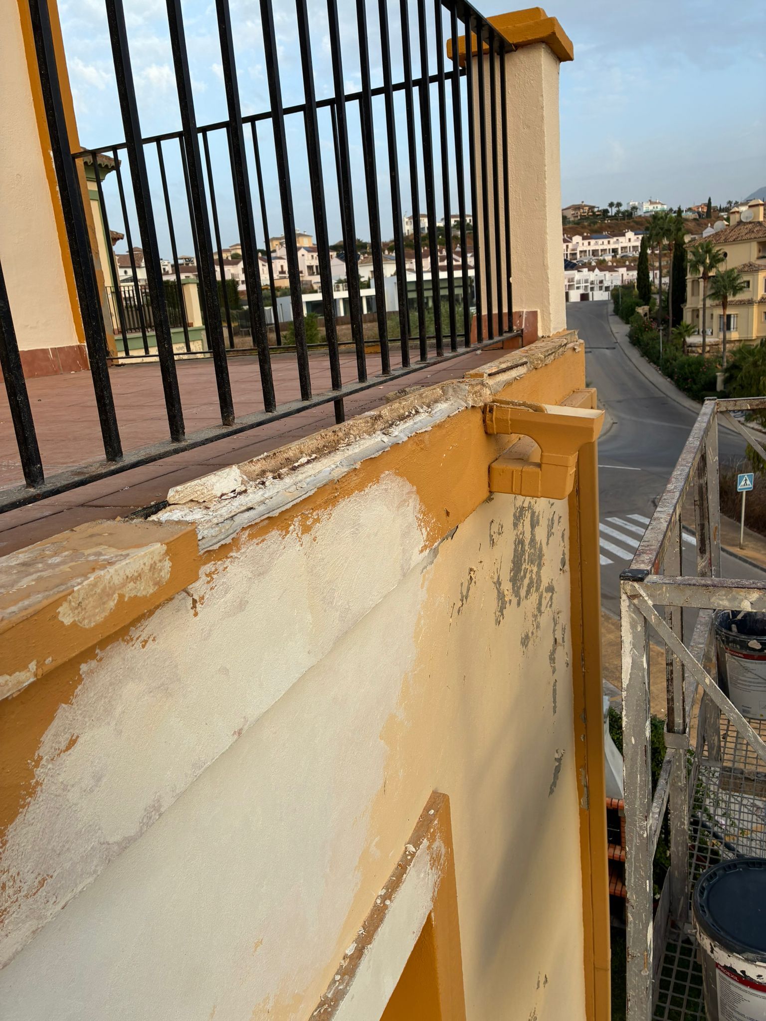 Rehabilitación de fachada y carpintería metálica, reconstrucción de cornisas, saneado de gavillas metálicas con convertidor de óxido y aplicación de mortero reparador con inhibidor aplicación de fijador procofisx diluido con agua y terminación de dos capas de procokril en el color base y renovatherm en los colores mas oscuros