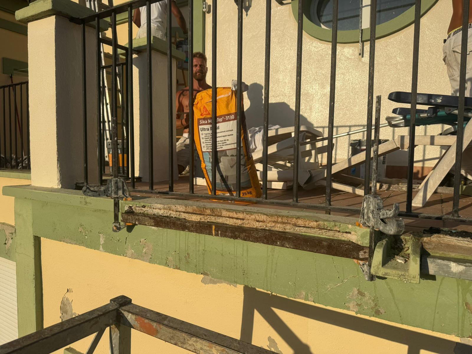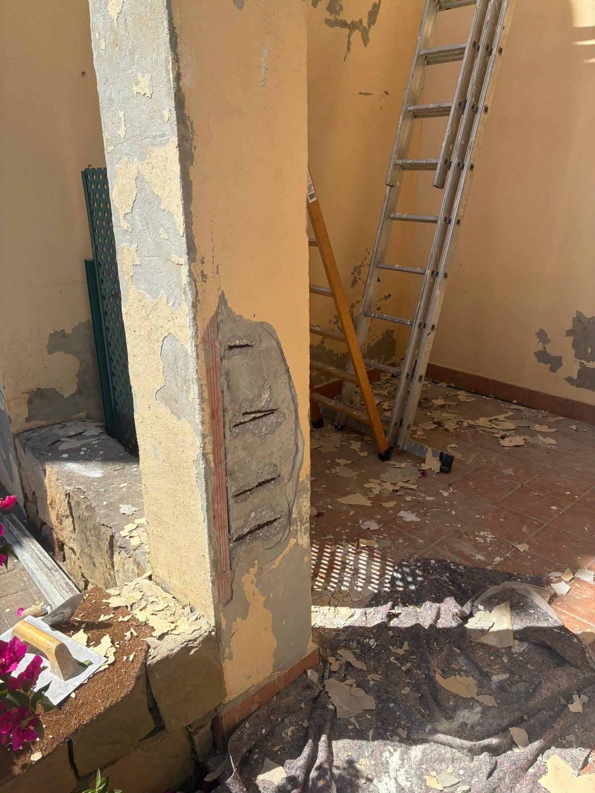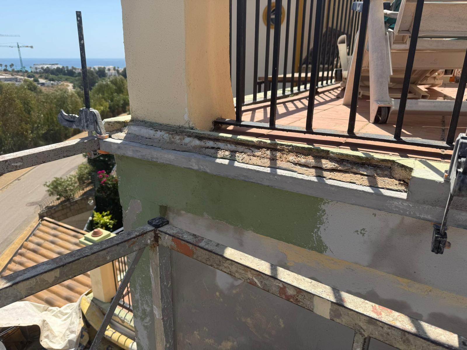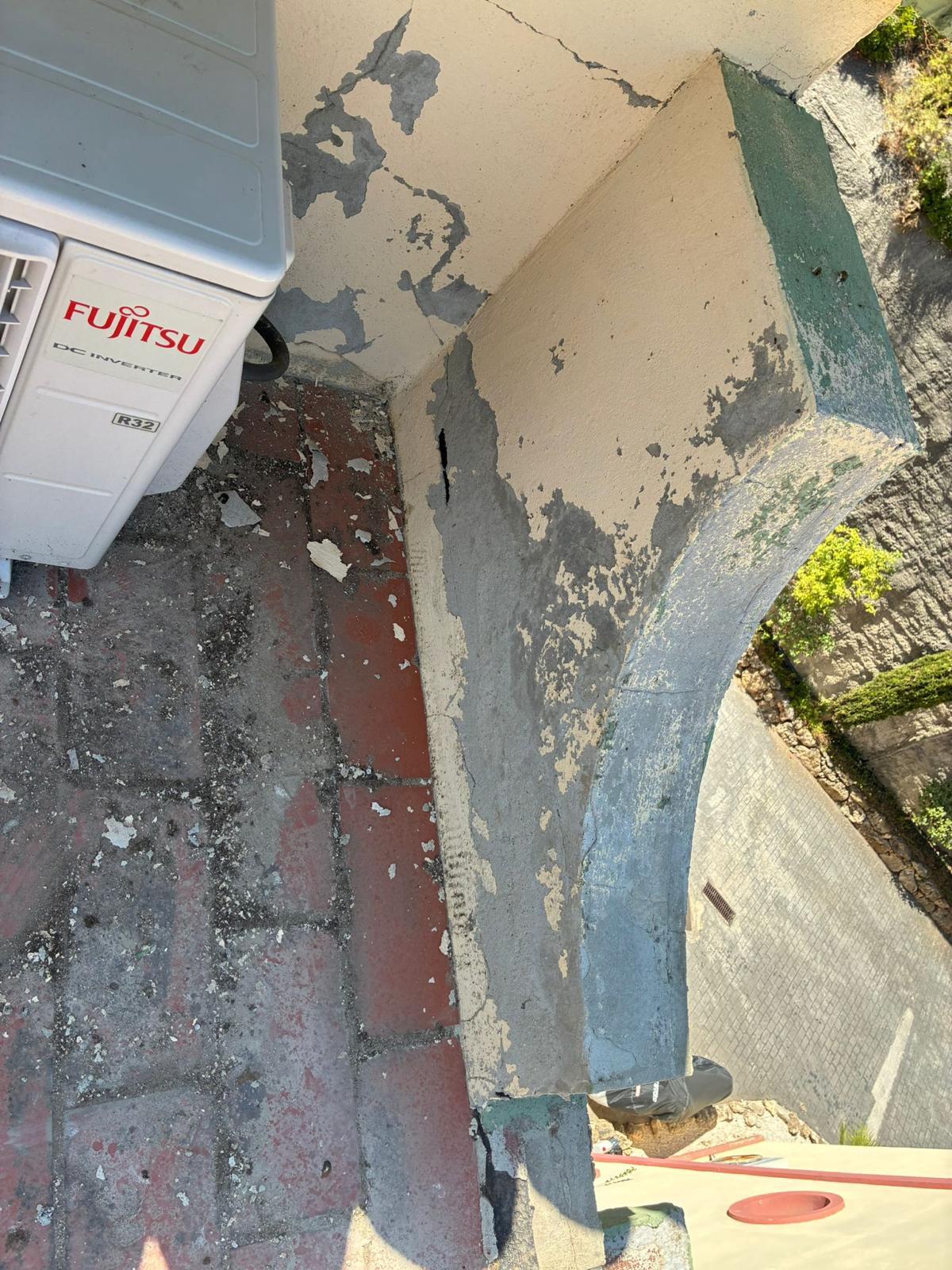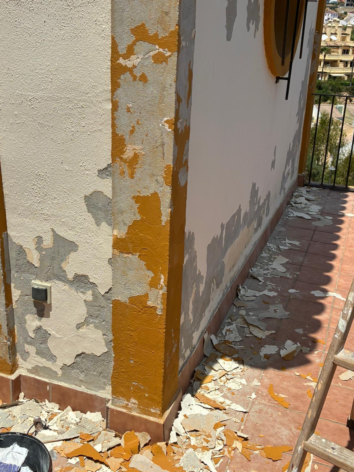 Rehabilitación de fachada y carpintería metálica, reconstrucción de cornisas, saneado de gavillas metálicas con convertidor de óxido y aplicación de mortero reparador con inhibidor aplicación de fijador procofisx diluido con agua y terminación de dos capas de procokril en el color base y renovatherm en los colores mas oscuros