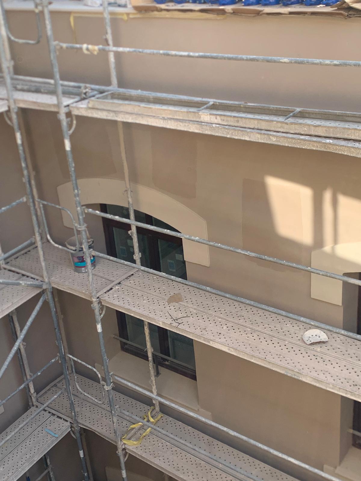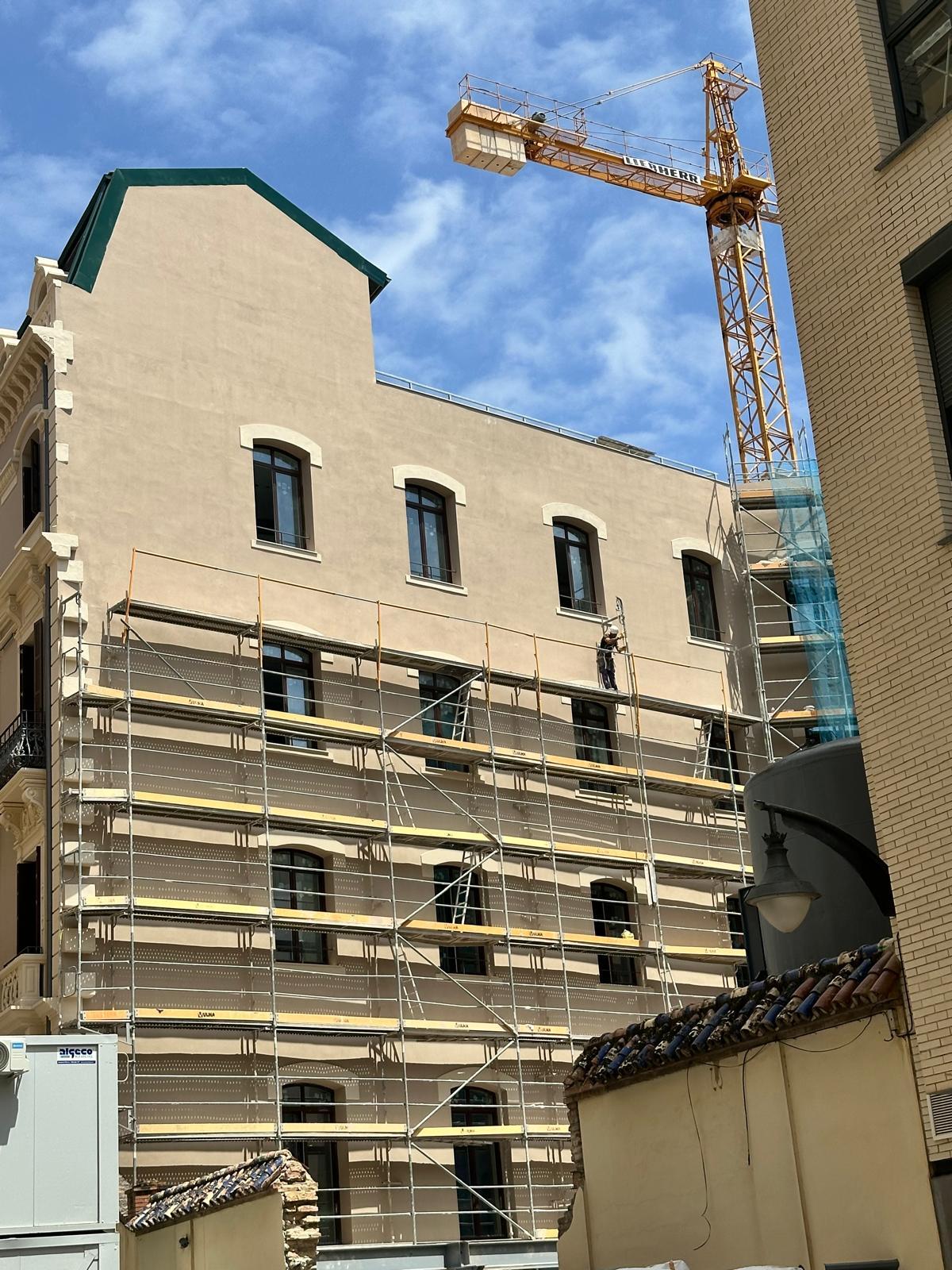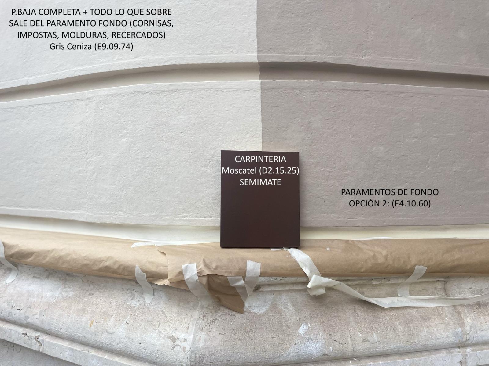 Para poder acceder a alguna de las partidas de Pintura, se cuenta con la labor y asistencia de PROCOLOR (Gorka Beain), para argumentar el Cambio de algunas partidas con mejoras, productivas, durabilidad, aspecto mineral, Certificados, Prescripción y garantía, 10C para aplicadores Homologados, finalmente tras diversas reuniones, la Propiedad aprueba el cambio, y se consiguen la partida de 7.000 m² de fachada, enfoscados, tendidos y recuperación de volúmenes, con distintos tipos de mortero a la cal, y posterior sistema SOL SILICATO, inicialmente, la obra se comienza con SUPRALIET SPRIMER y ACABADO, de SIKKENS, y en su momento, con el nuevo formato y marca, del mismo PROCOSIL FONDO y PROCOSIL ACABADO, con los colores de la carta del "centro histórico" de Málaga, By PROCOLOR, colaborando con la oficina de rehabilitación del centro Histórico de Málaga, y elementos férricos con Procofer. Es fruto del trabajo en equipo.