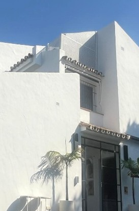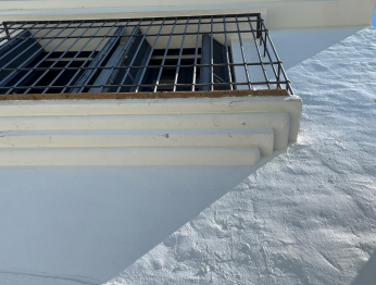 Tras la limpieza con agua a presión, sellado de fisuras con masillas fibradas, Se hicieron, reparaciones, y tendidos con morteros R4, Grano grueso y acabado con grano fino, posteriormente se han enfoscado estos paramentos exteriores, Se consolidan los soportes con ALPHALOXAN PRIMER en dilución 30% con agua, para uniformizar, superficies, y 2 manos de PROCOTEX EXTRALISO BLANCO MEDITERRANEO, Flexible A1 por su baja tensión superficial, y su excelente luminosidad que da amplitud al conjunto.