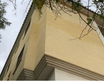 Inmueble, muy deteriorado, y con falta de mantenimiento, en entorno urbano y costero, se acomete, el lavado a presión con Agua de los paramentos exteriores, picado, de zonas inestables, pasivación de forjados, con PROCOFER EXPERT CONVERTIDOR, recuperación de volúmenes con Mortero fribrados apropiados, saneado de fisuras con masillas Fibradas, Mano de consolidación a todos los paramentos con PROCOFIX en dilucion 6:1 (Paramentos de fachada) y ACRILFIX, dilución 30% con agua (molduras de hormigón, balustradas) y dos manos en tiempo y forma de PROCOTEX EXTRA LISO BLANCO MEDITERRANEO (Fachada Principal), y LITOCRIL (Col, según muestra)