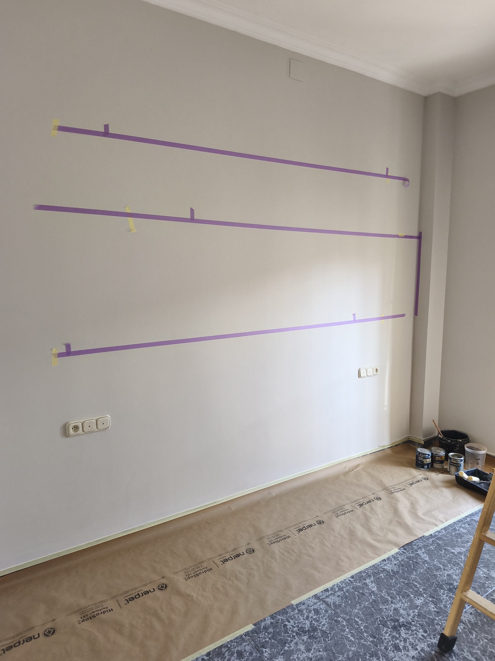 En la pared del dormitorio, realizamos otra decoración, mediante una geometría estudiada en proporciones áureas y con el juego de reserva con cinta y transparencias. Para esta decoración también utilizamos la gama de productos Kilate acritec, en este caso la base transparente y los metalizados en diferentes diluciones con agua para crear las diferentes opacidades y efectos.