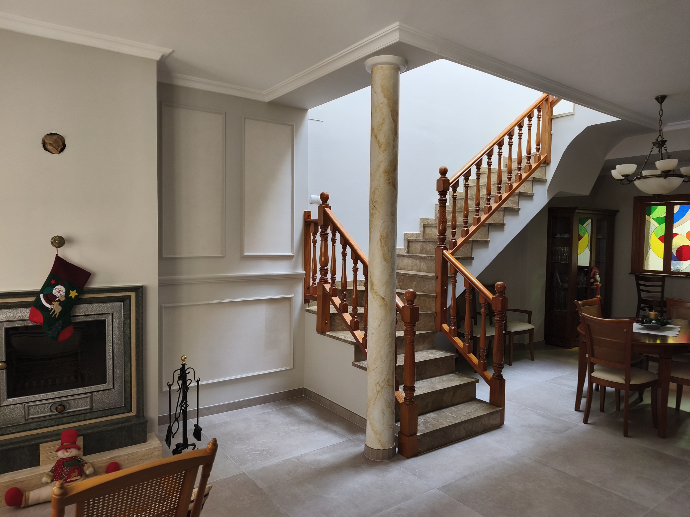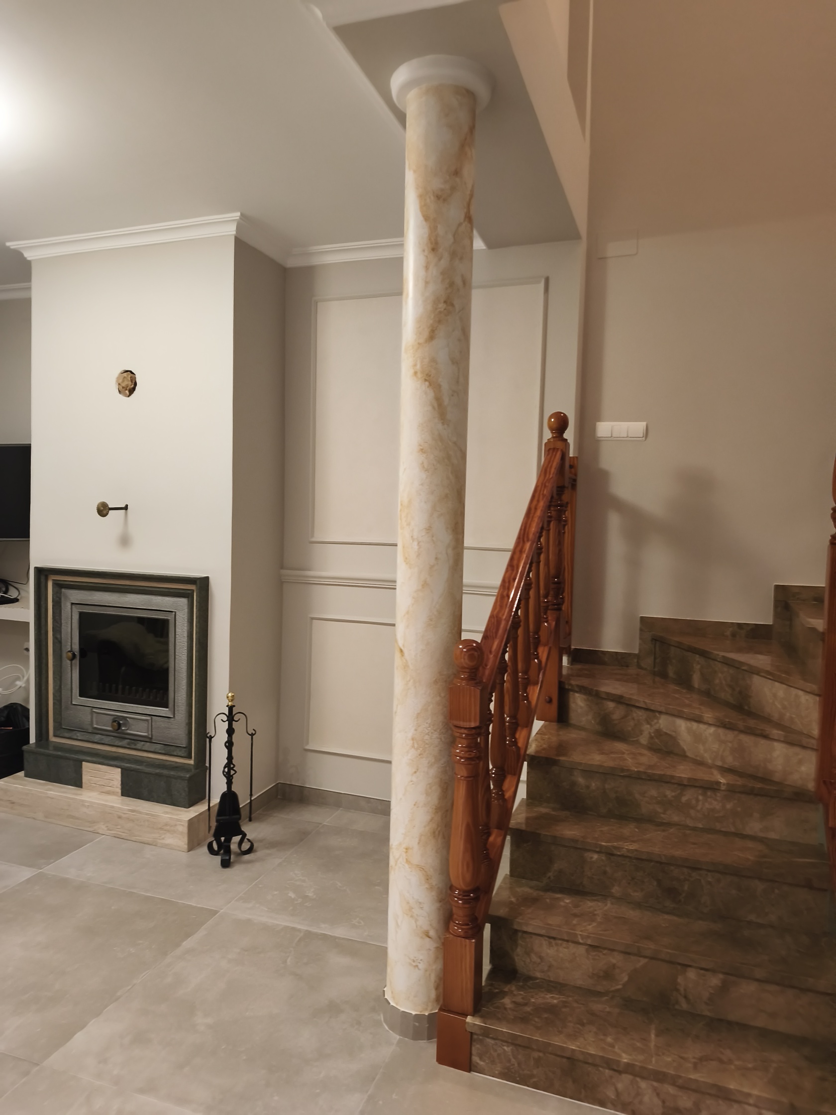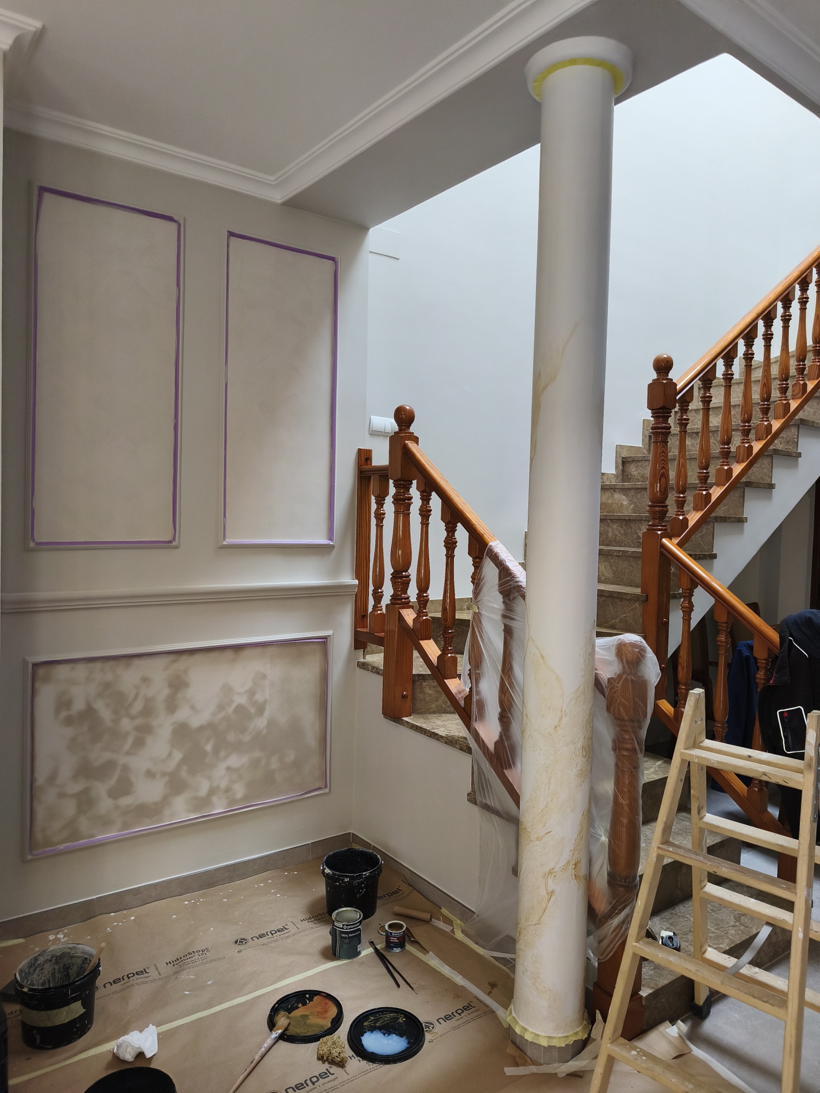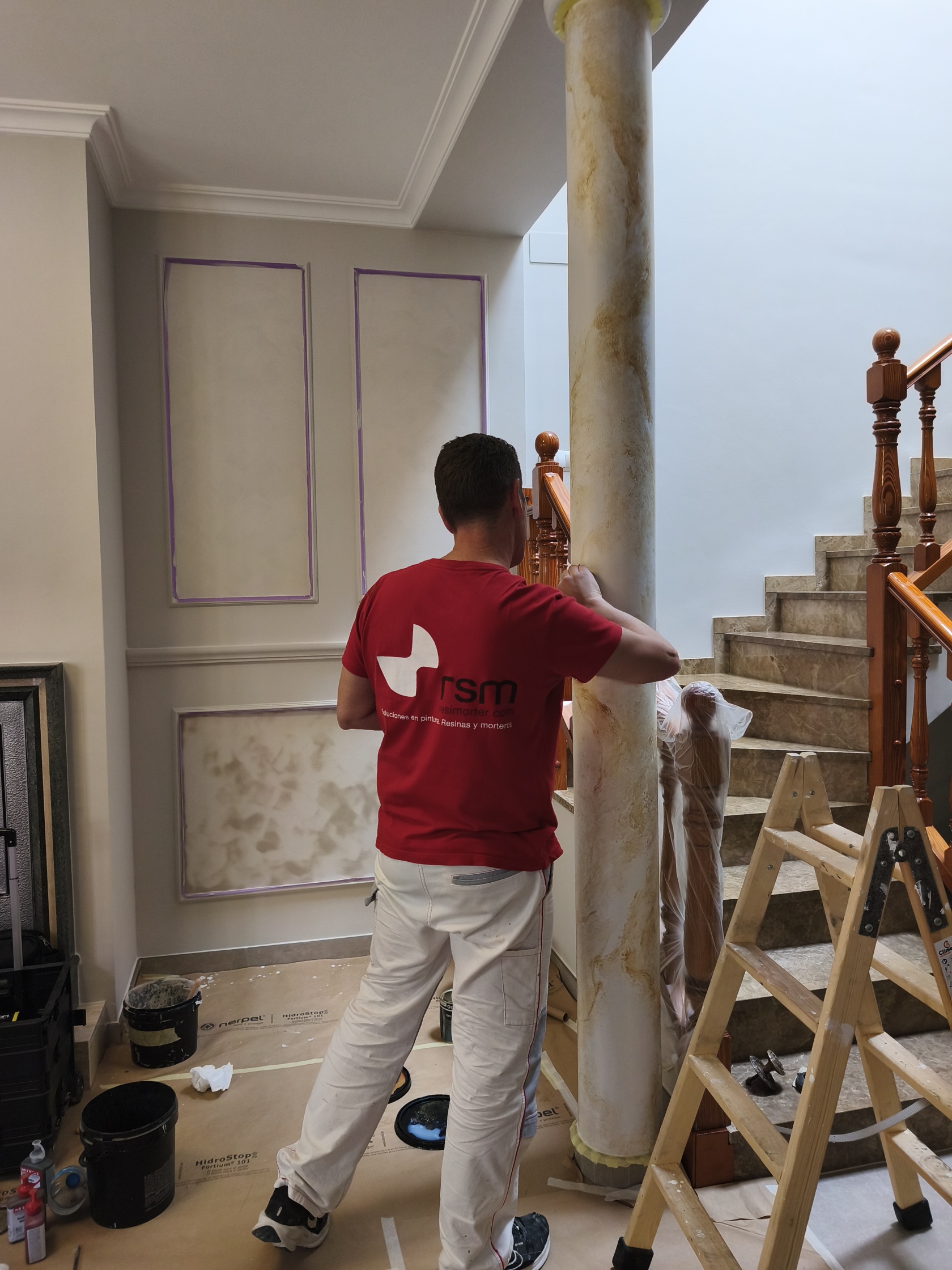 Además de la pintura de las paredes y los techos, realizamos la decoración del pilar con imitación a mármol, ejecutada con la gama de productos Kilate acritec, mezclando la base transparente y el color ocre, creando transparencias y efectos con la esponja marina y trapos. Acabamos con los detalles de las vetas realizadas a pincel.