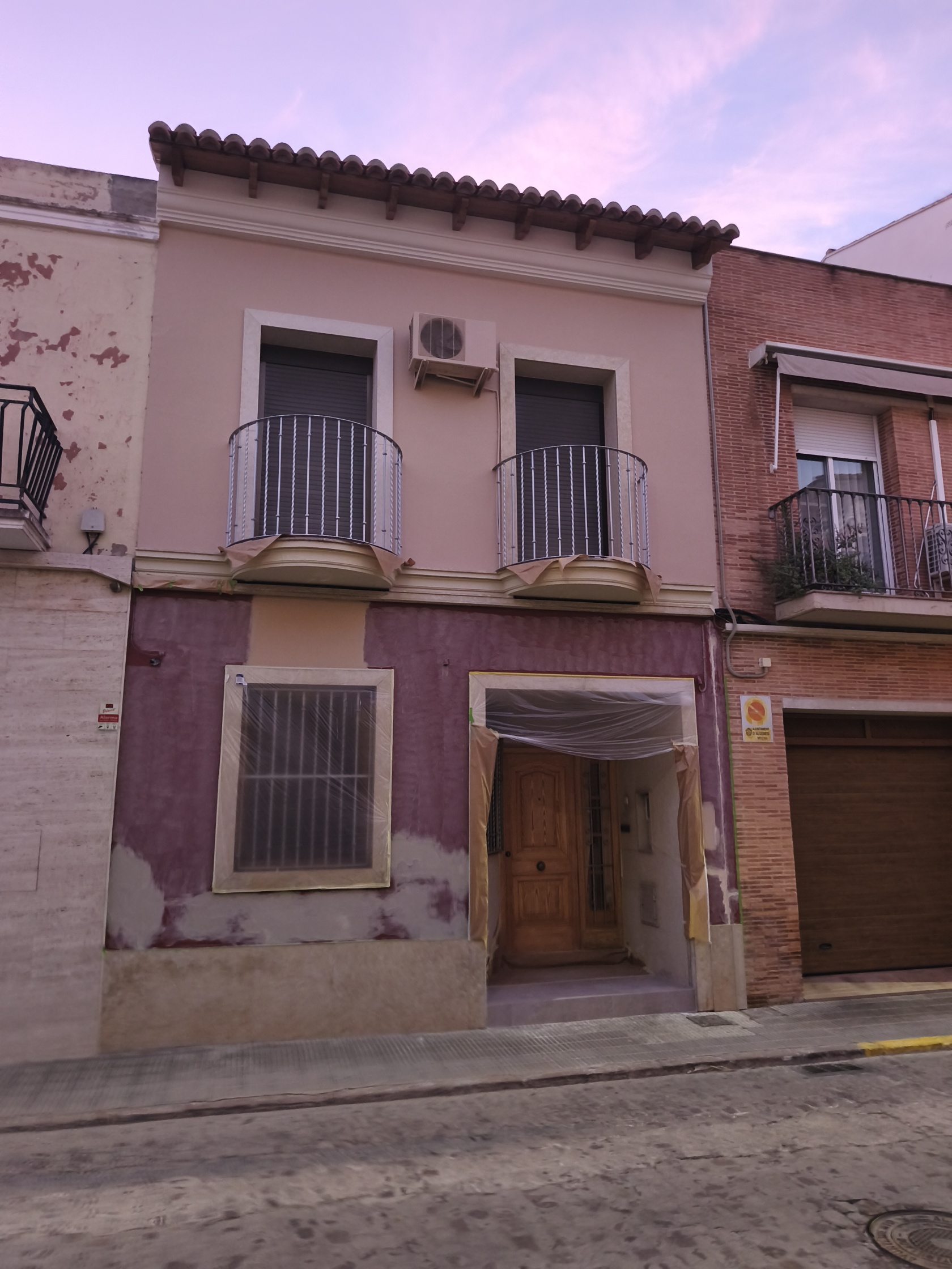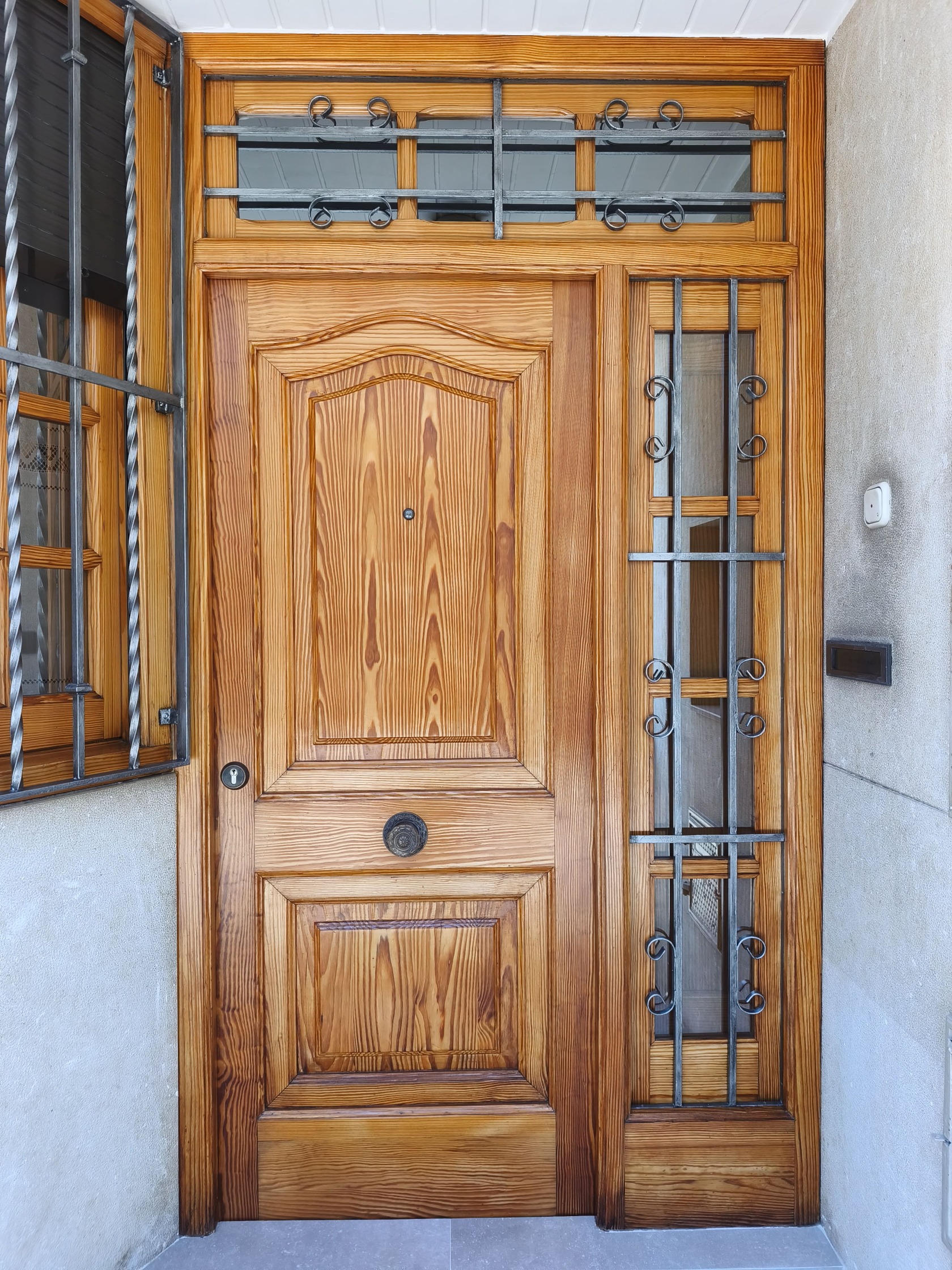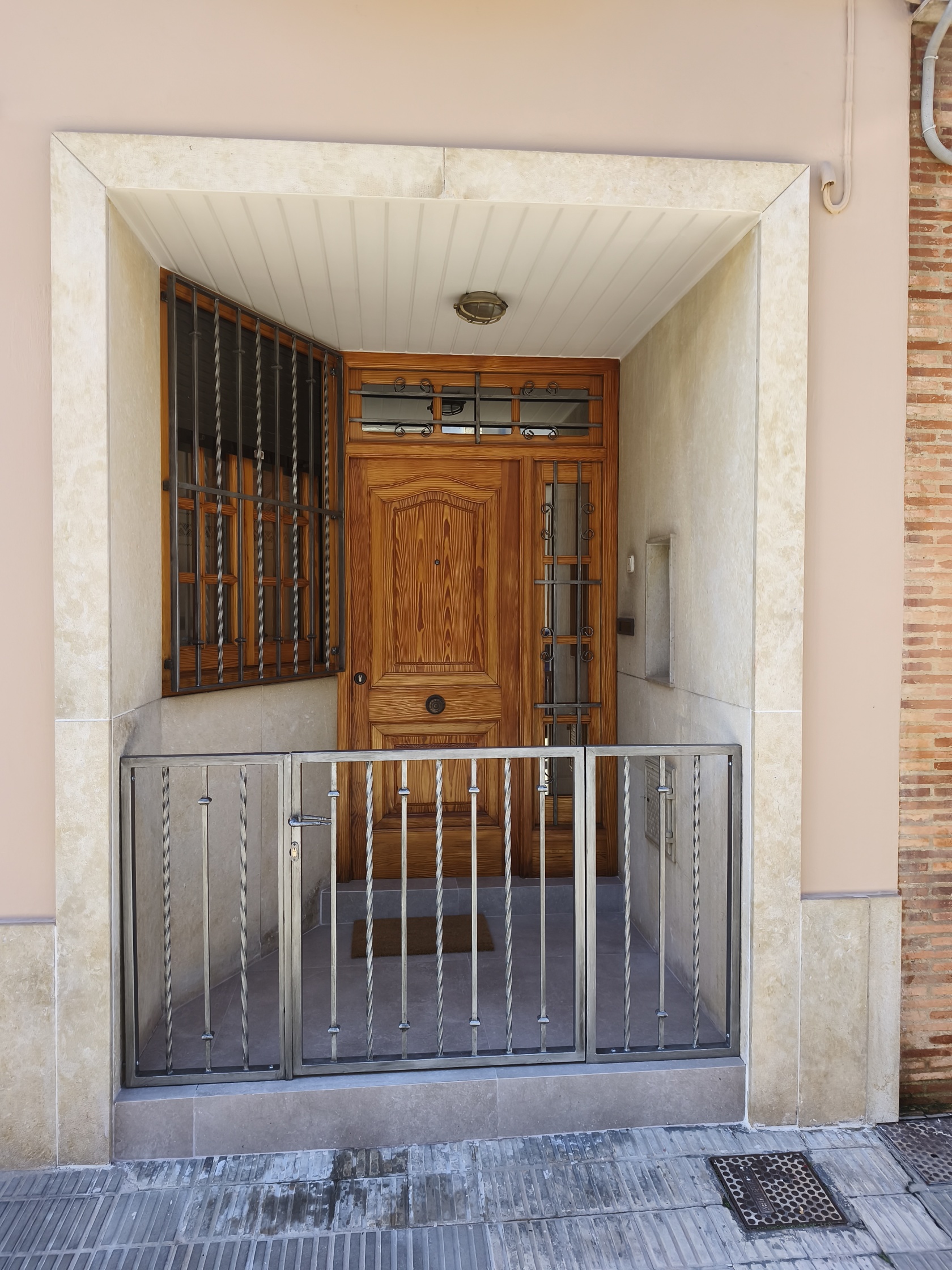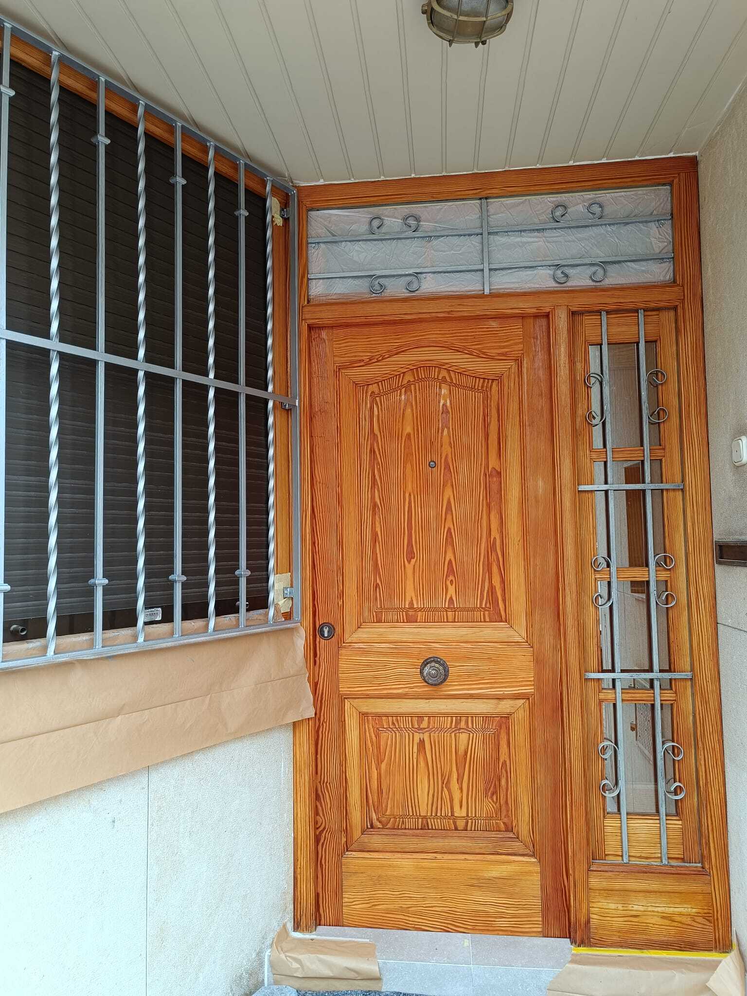 Rehabilitación tras la DANA de las puerta de MADERA de entrada a la vivienda y las rejas de HIERRO de la fachada.
