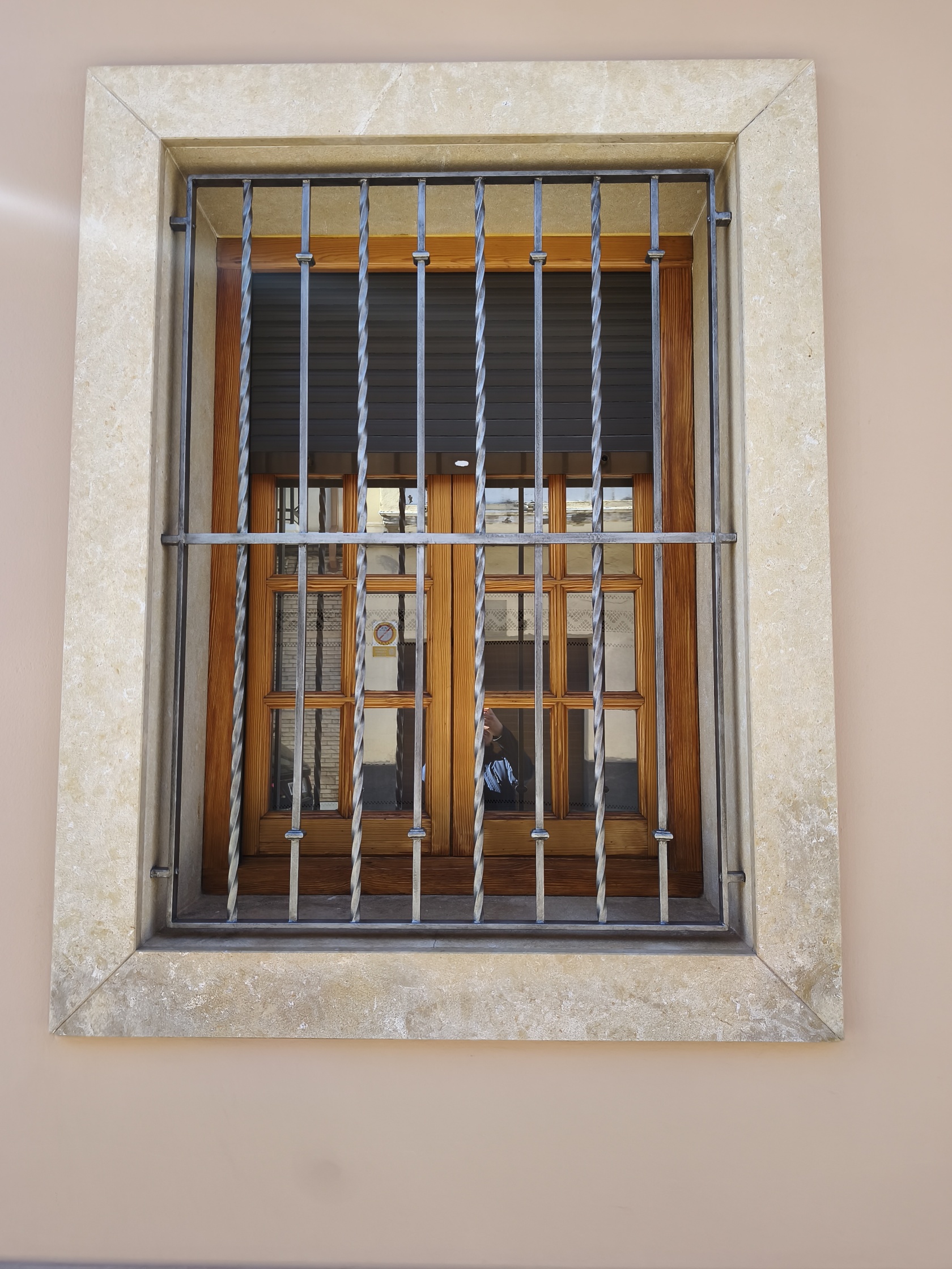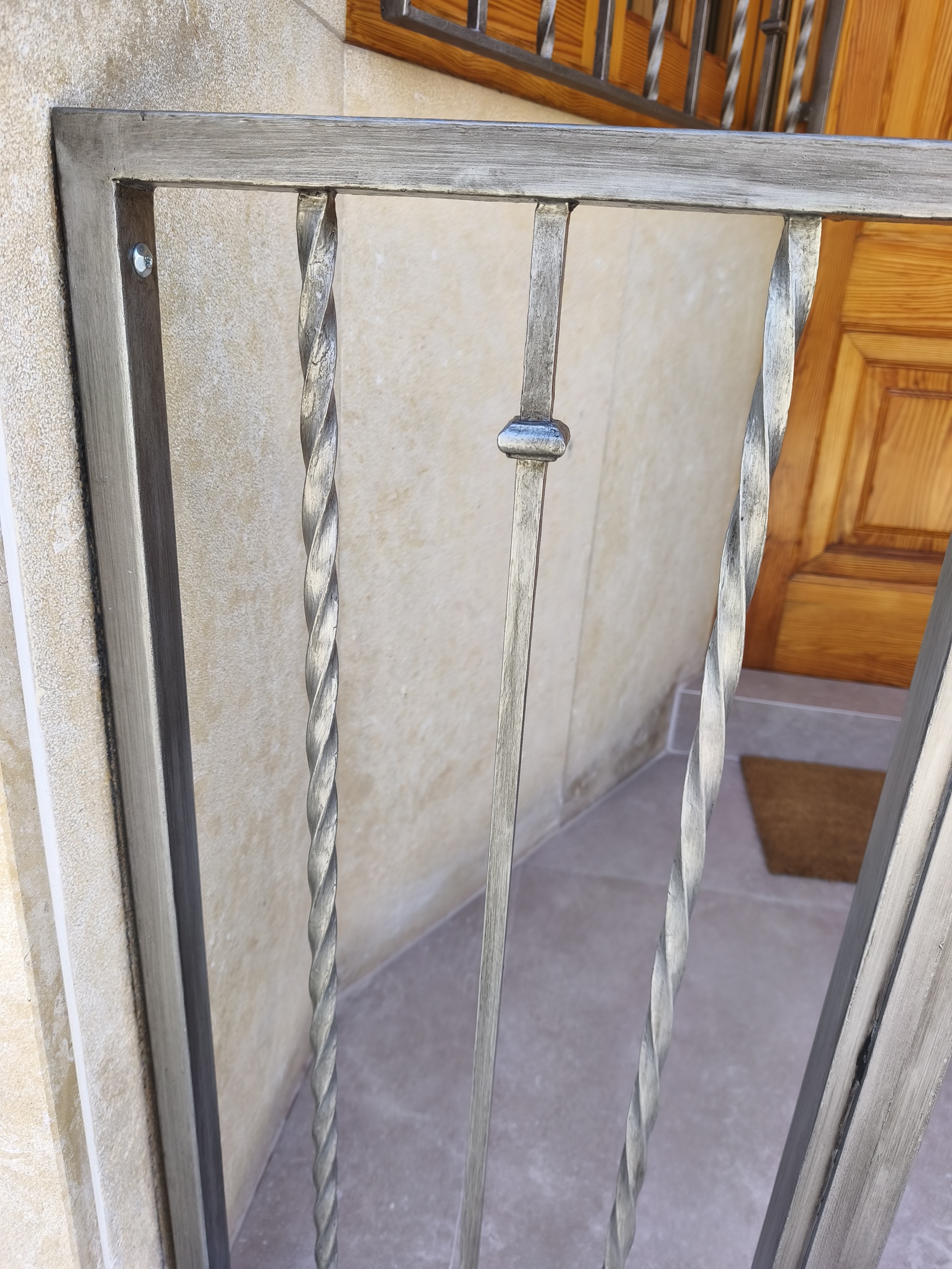 Las rejas de hierro, tras el lijado se aplican los productos KILATE ACRITEC, primera capa con acritec metalico en plata y acabado con una veladura mezcla de metalizado negro y base trasparente.