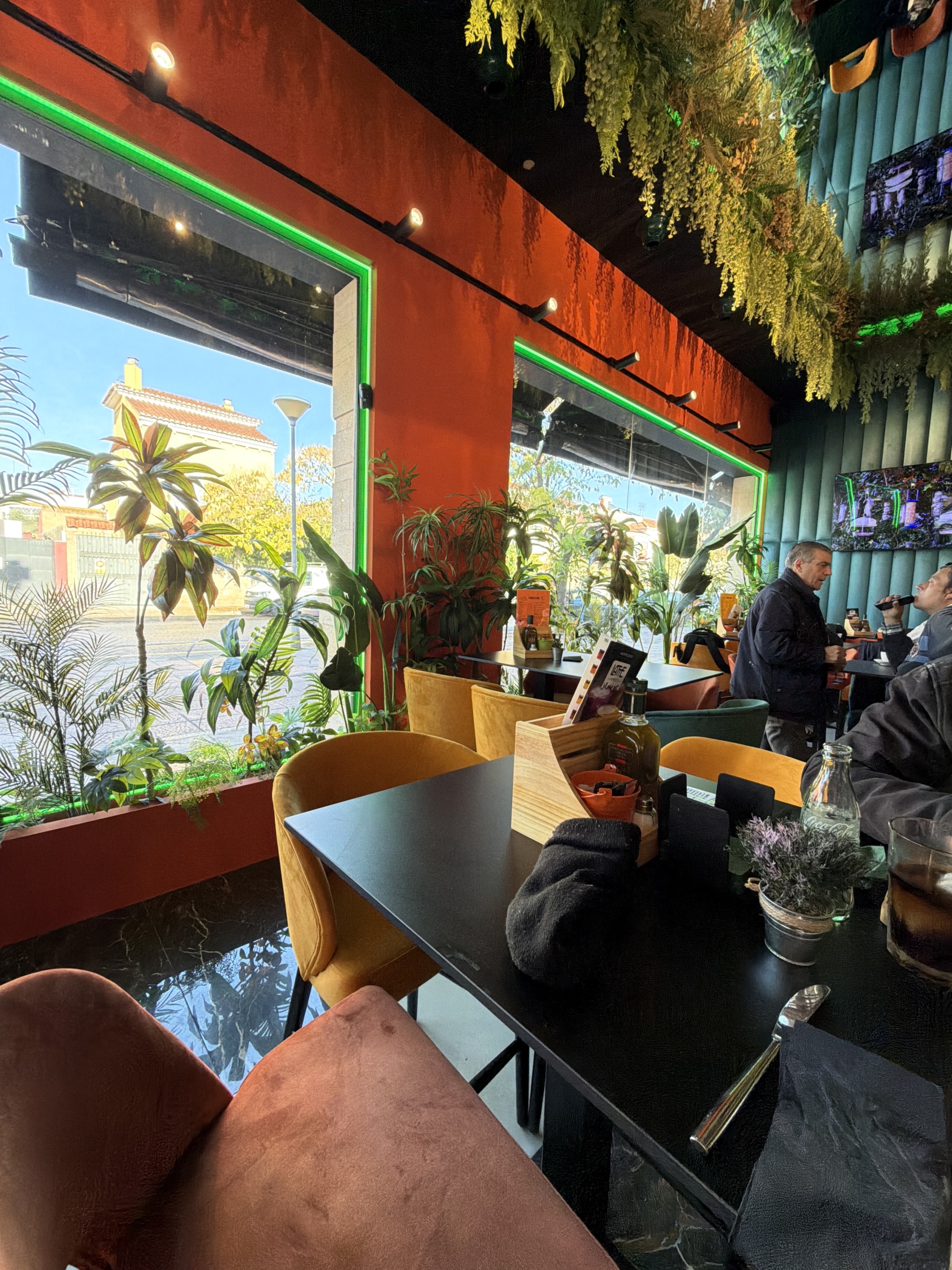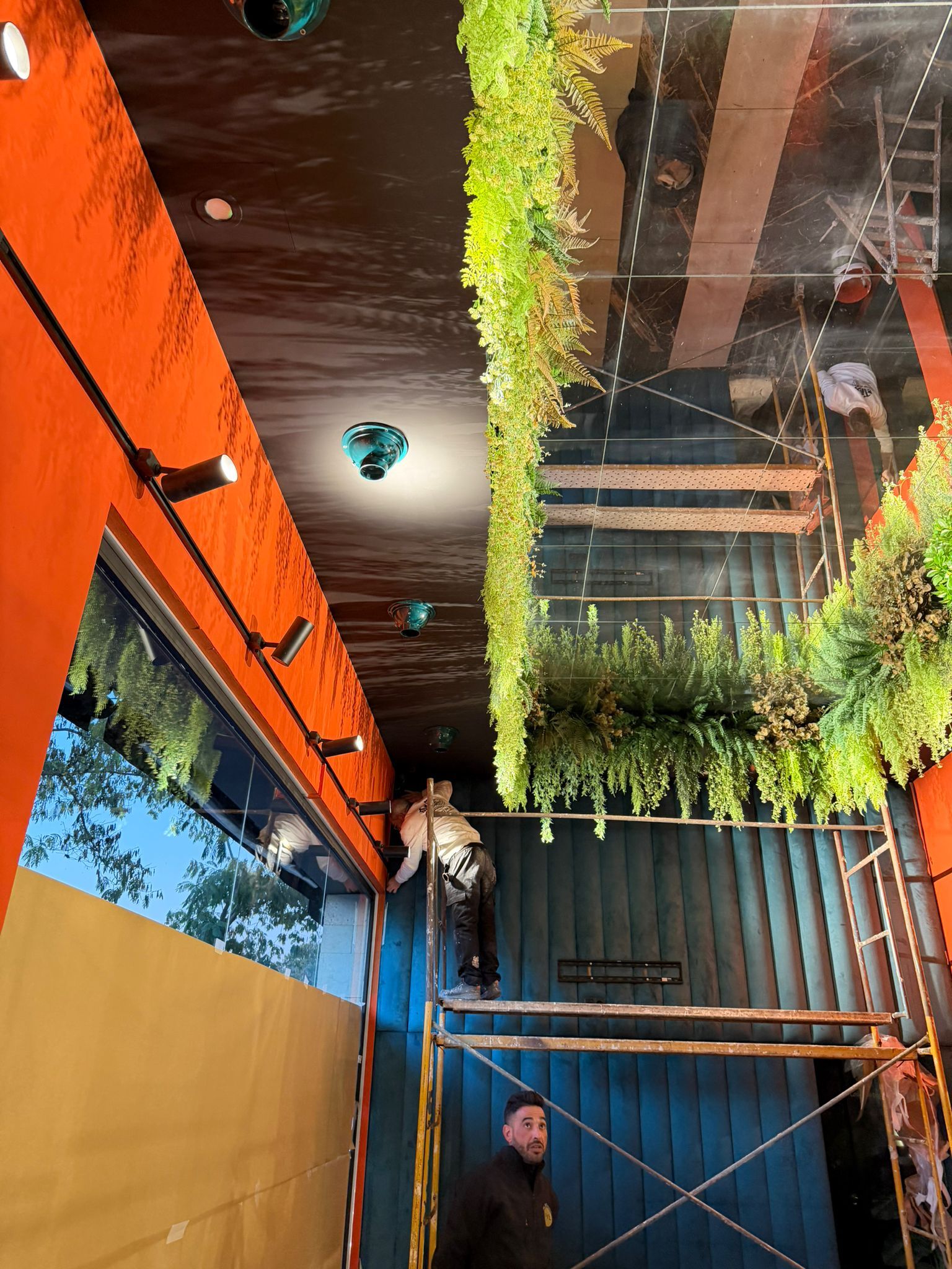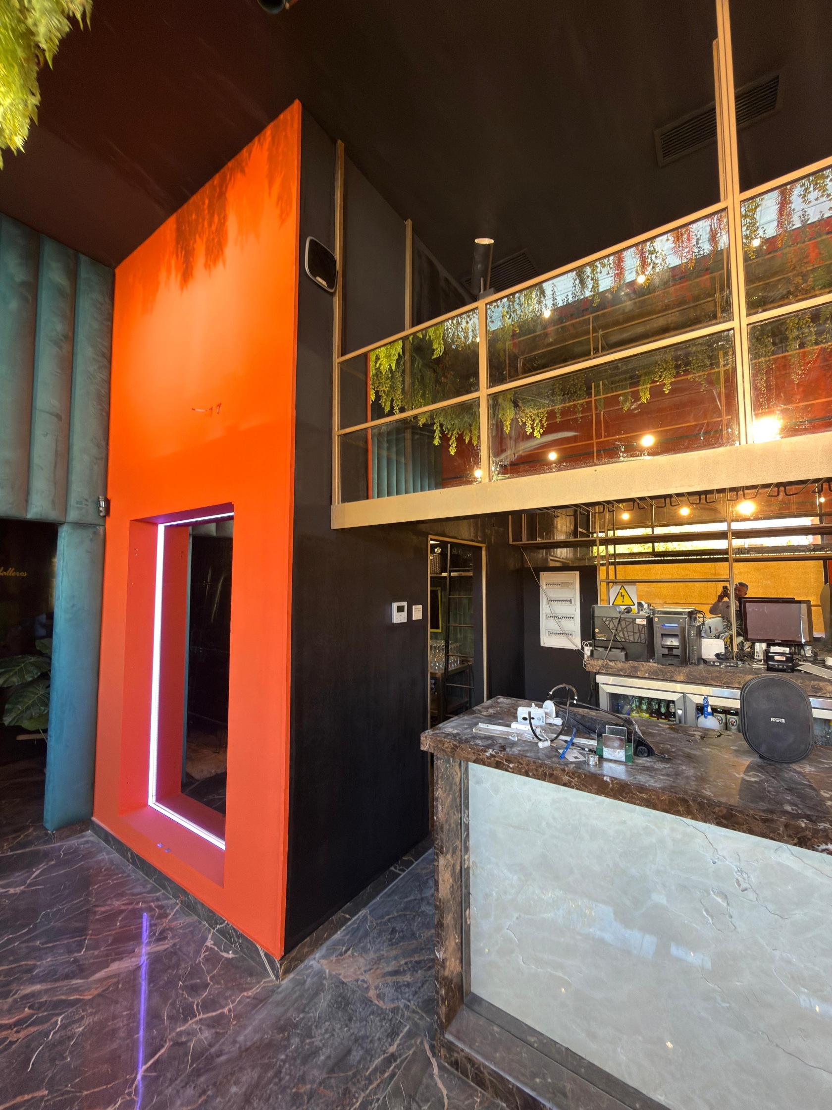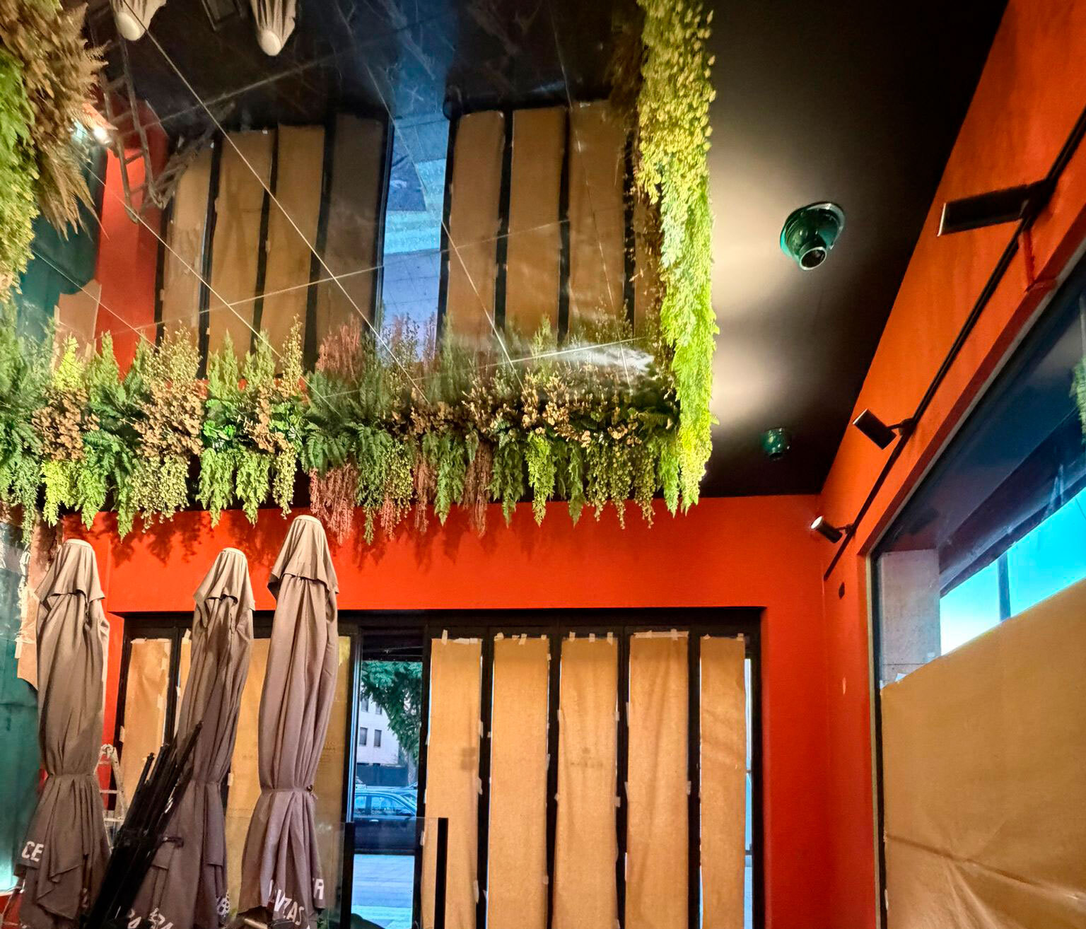 El establecimiento presentaba originalmente paredes en tonos gris azulado. El cliente solicitó una transformación completa hacia un color anaranjado-rojizo, similar al RAL 2001, con el objetivo de aportar mayor personalidad y calidez al espacio.