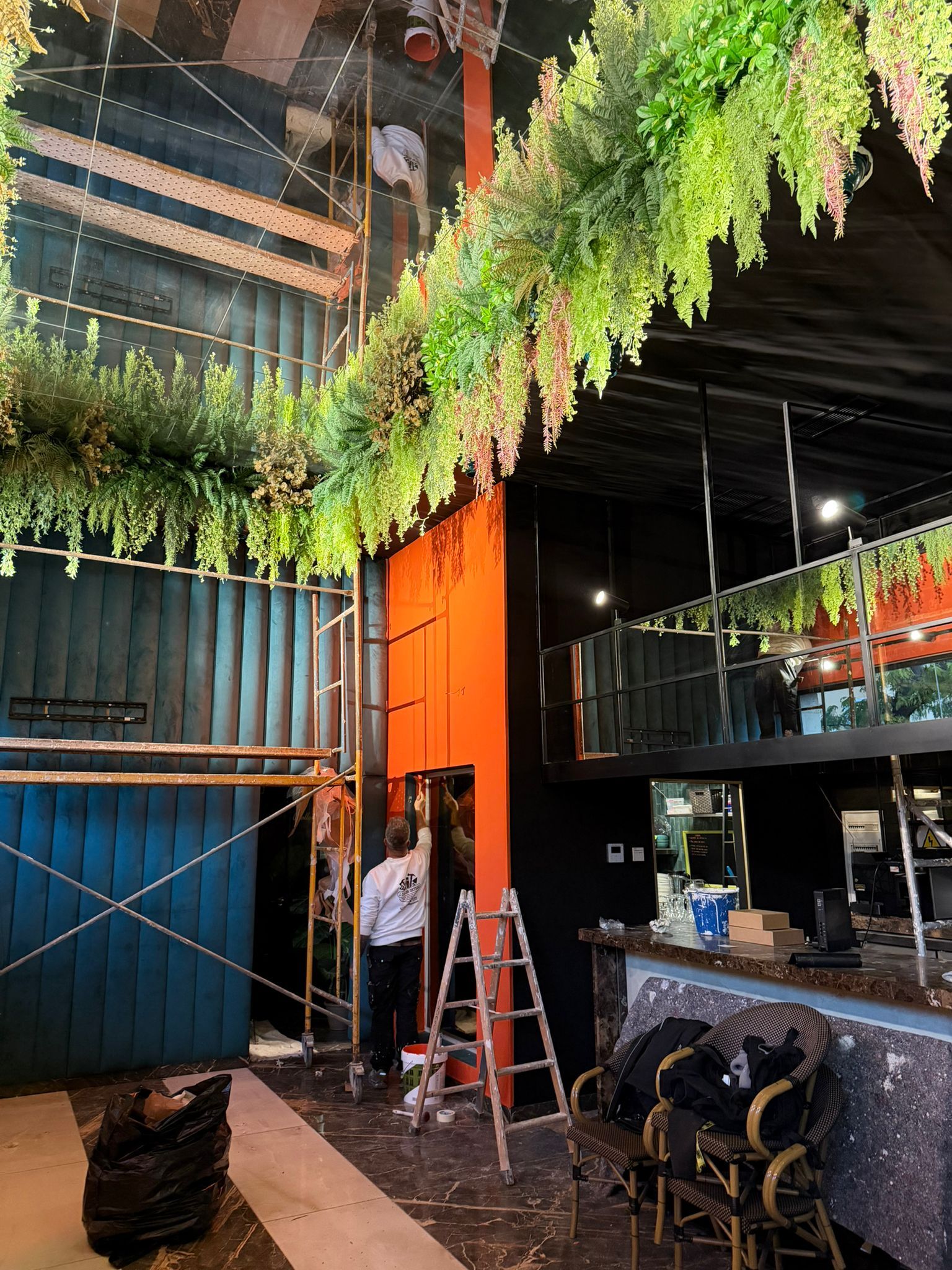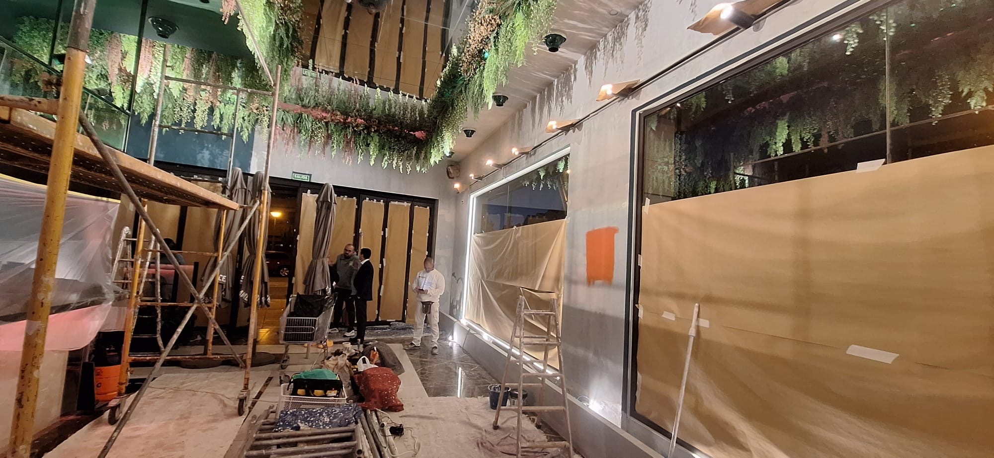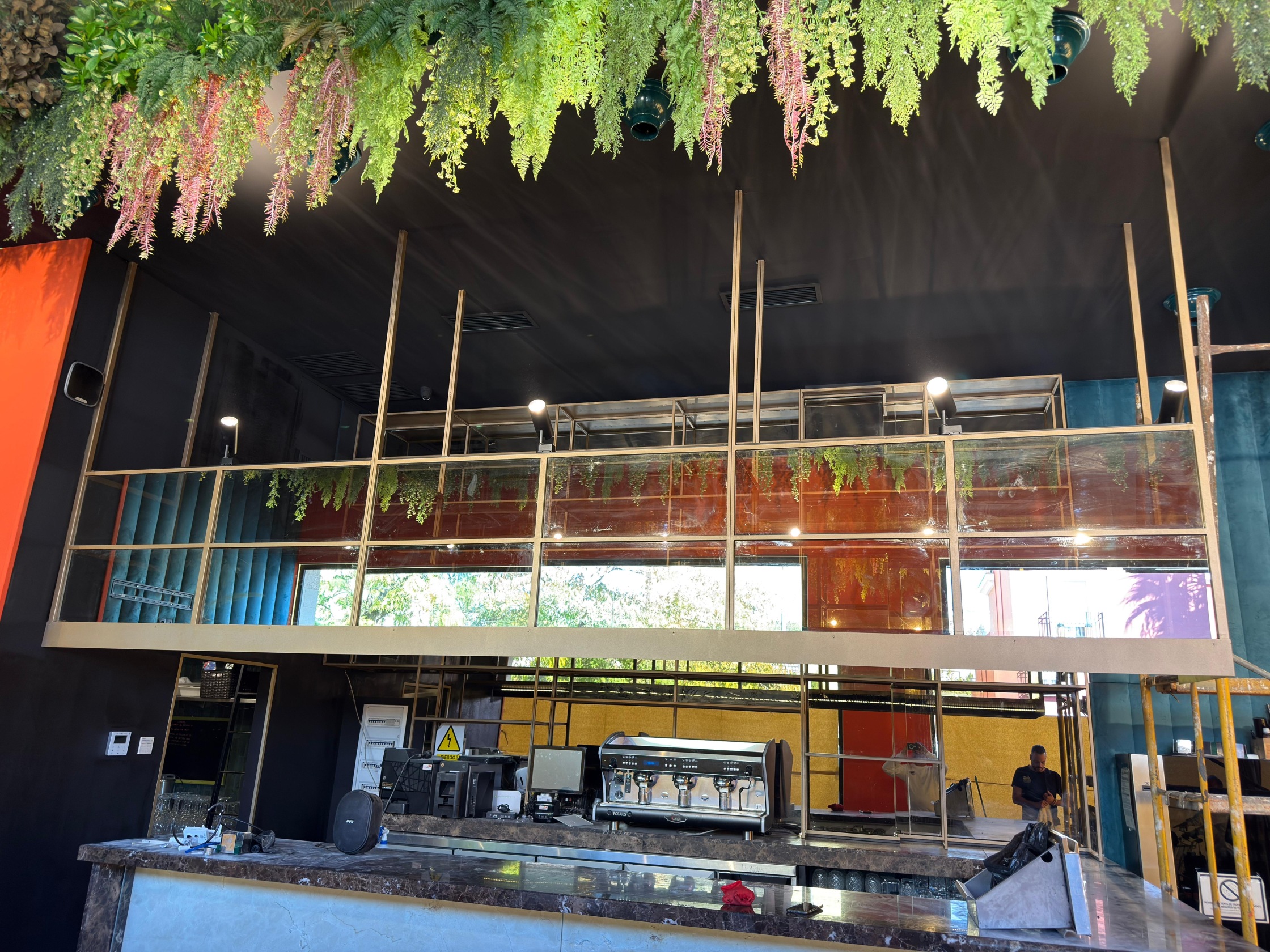 El establecimiento presentaba originalmente paredes en tonos gris azulado. El cliente solicitó una transformación completa hacia un color anaranjado-rojizo, similar al RAL 2001, con el objetivo de aportar mayor personalidad y calidez al espacio.