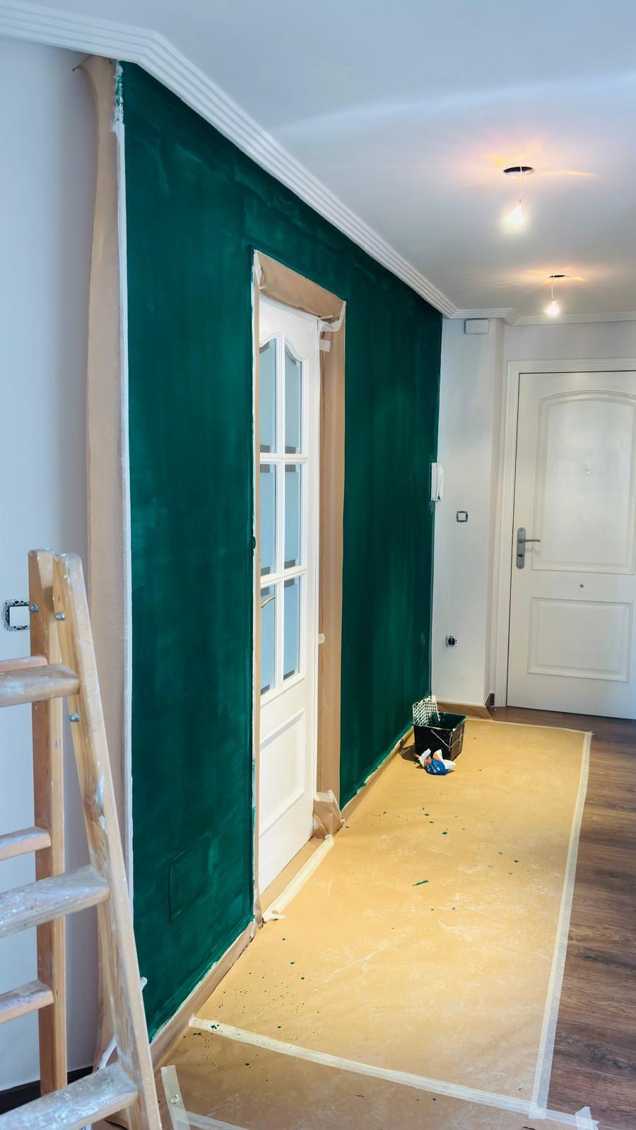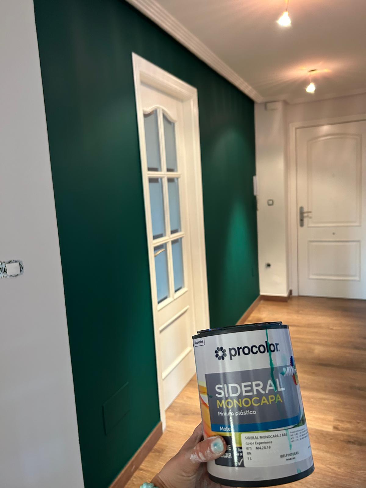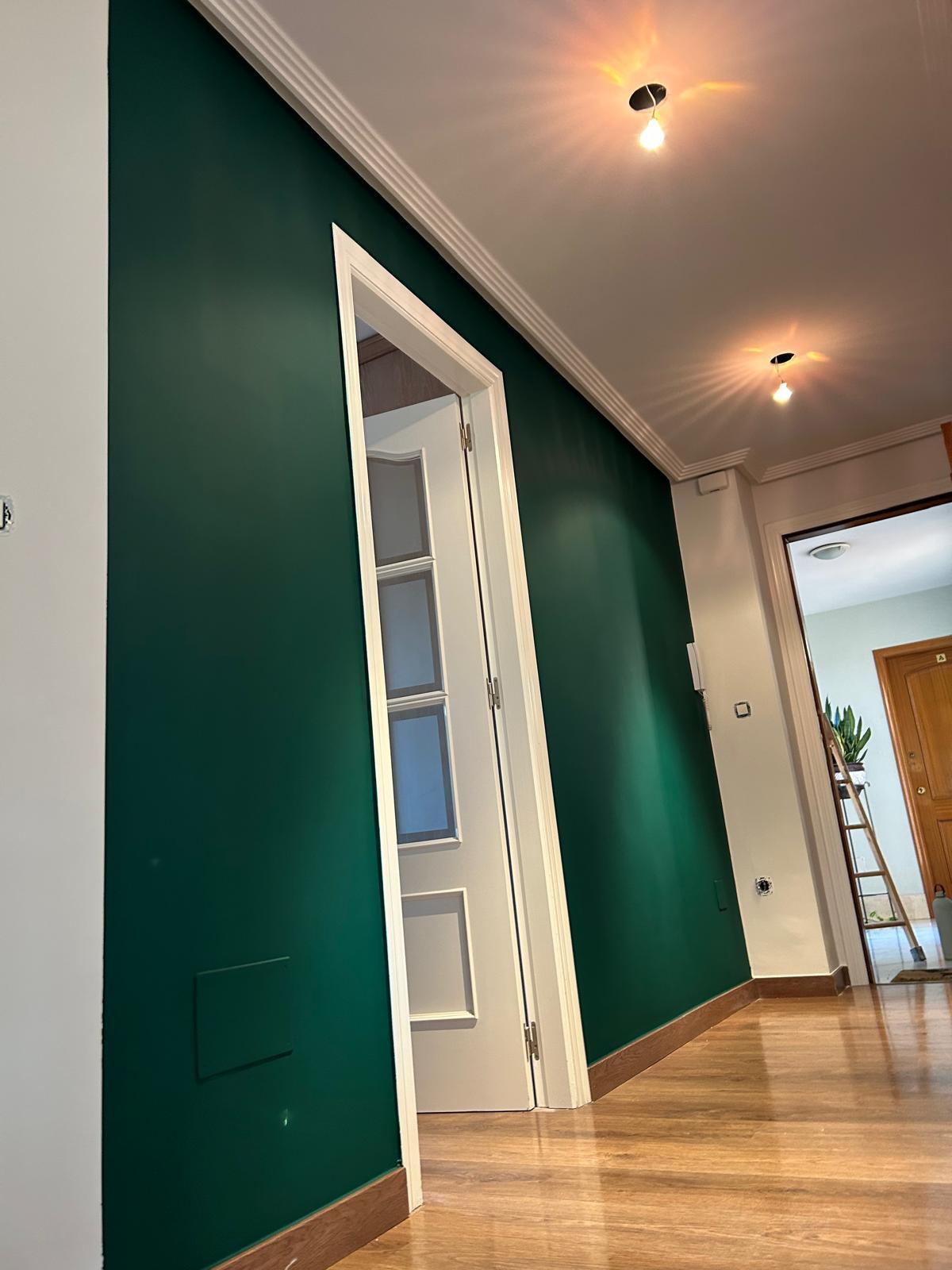 Aquí os presento este cambio de color en una pared de la entrada de una vivienda, los dueños han elegido este verde tan elegante y para ello, primero he reparado los desperfectos de la pared con masilla de renovación, lijado, y posteriormente he aplicado 3 capas de sideral eco monocapa. Gracias :)