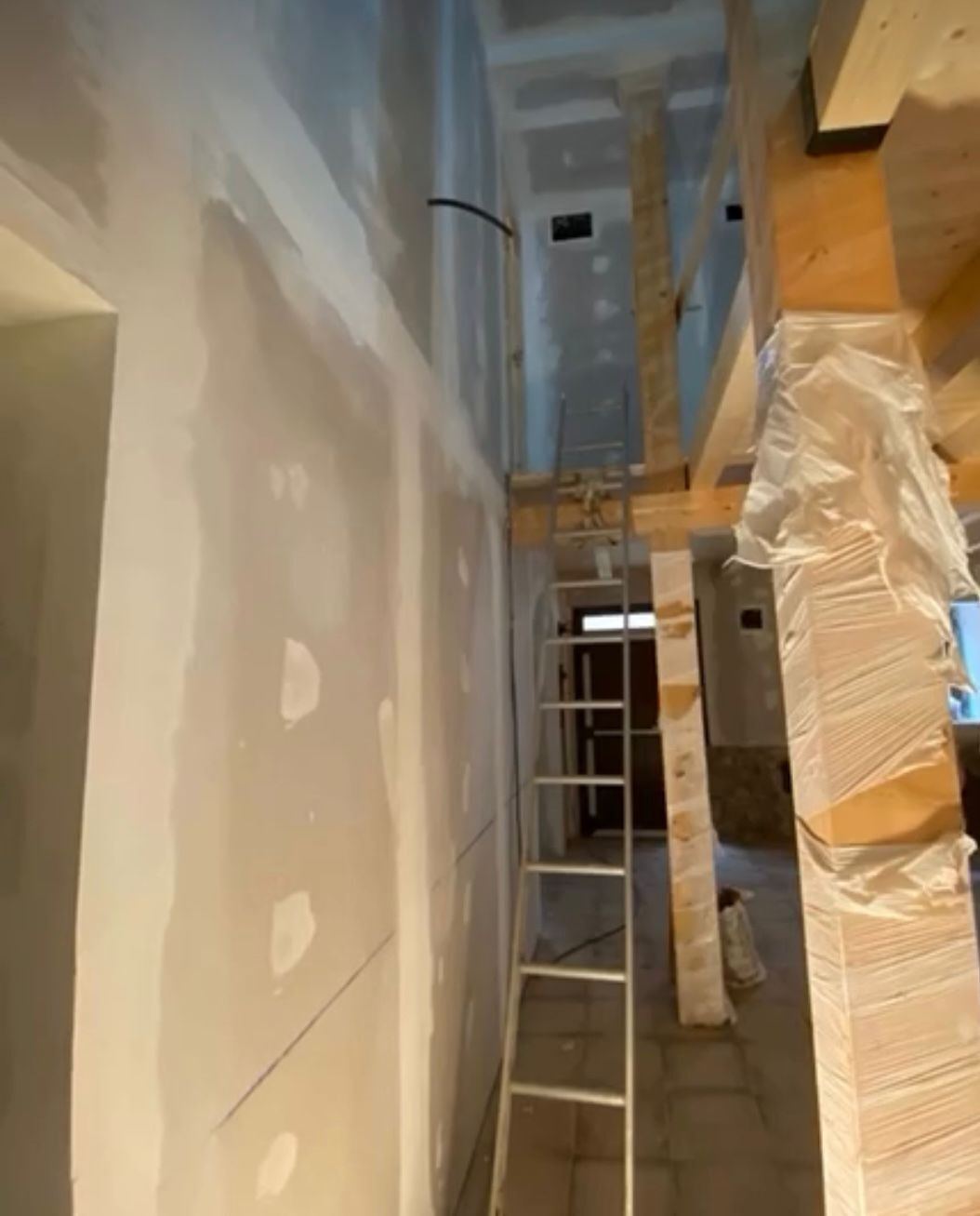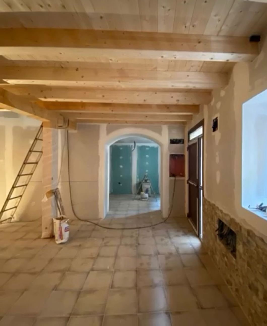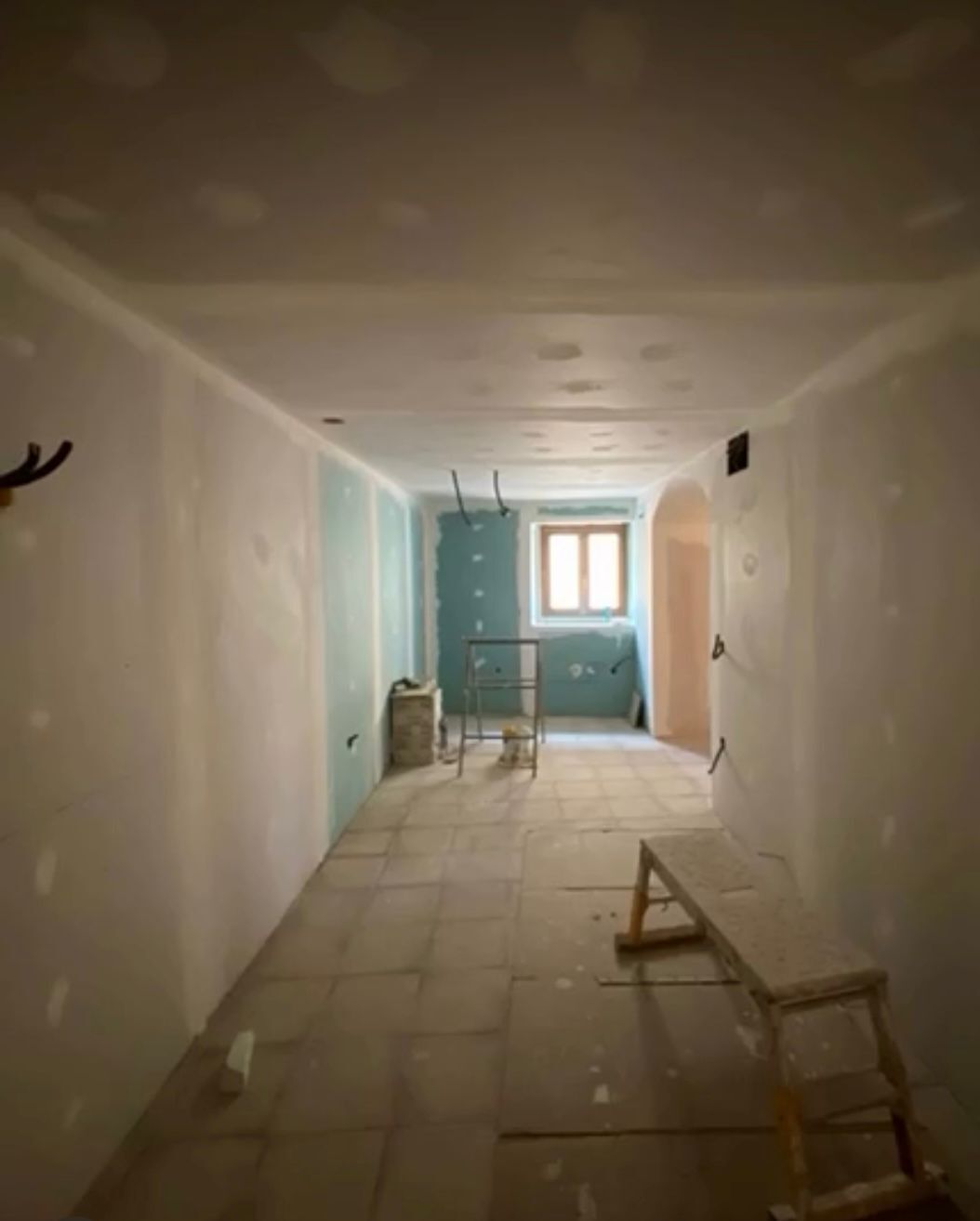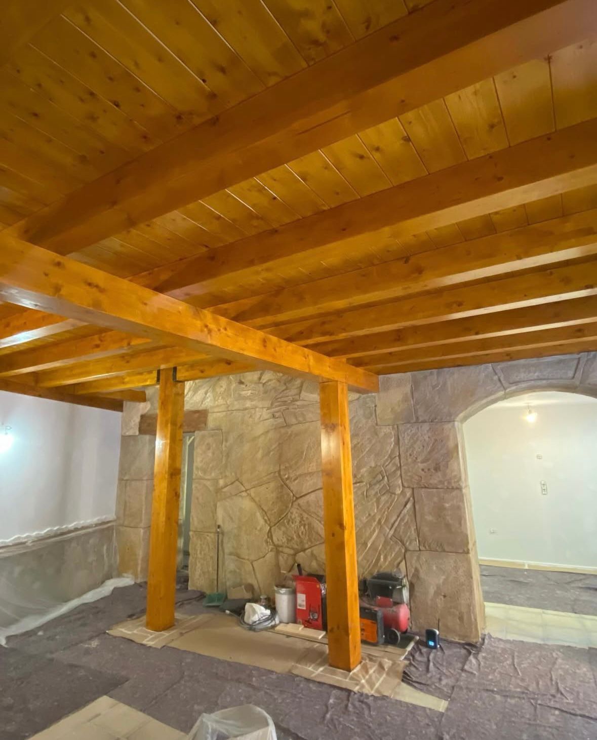 Mi intervención en el proyecto consistió en la ejecución integral de los trabajos de pintura interior de la vivienda, con especial énfasis en la protección y embellecimiento de las vigas de madera vista, elementos clave en la estética rústica y tradicional del futuro hotel.