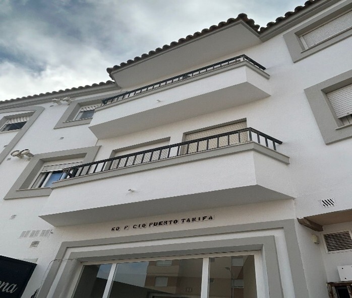 Se limpian los paramentos con Agua a presión, sellado de fisuras con masillas fibradas, Se hicieron, reparaciones, y tendidos con morteros R4, con grano fino, pasivado de alguna gavilla, con PROCOFER EXPERT CONVERTIDOR, posterior enfoscado de dichas, zonas, Se consolidan los soportes con PROCOFIX en dilución 6:1 con Agua, para uniformizar, superficies, y logran una mejor cubrición, y 2 manos de PROCOTEX LISO BLANCO MED. (Paramentos Principales de Fachada) y 2 Manos de PROCOTEX LISO GRIS PERLA (Resaltes), este acabado, es el mas durable, y minimiza las reparaciones, con su sílice y su alta opacidad.