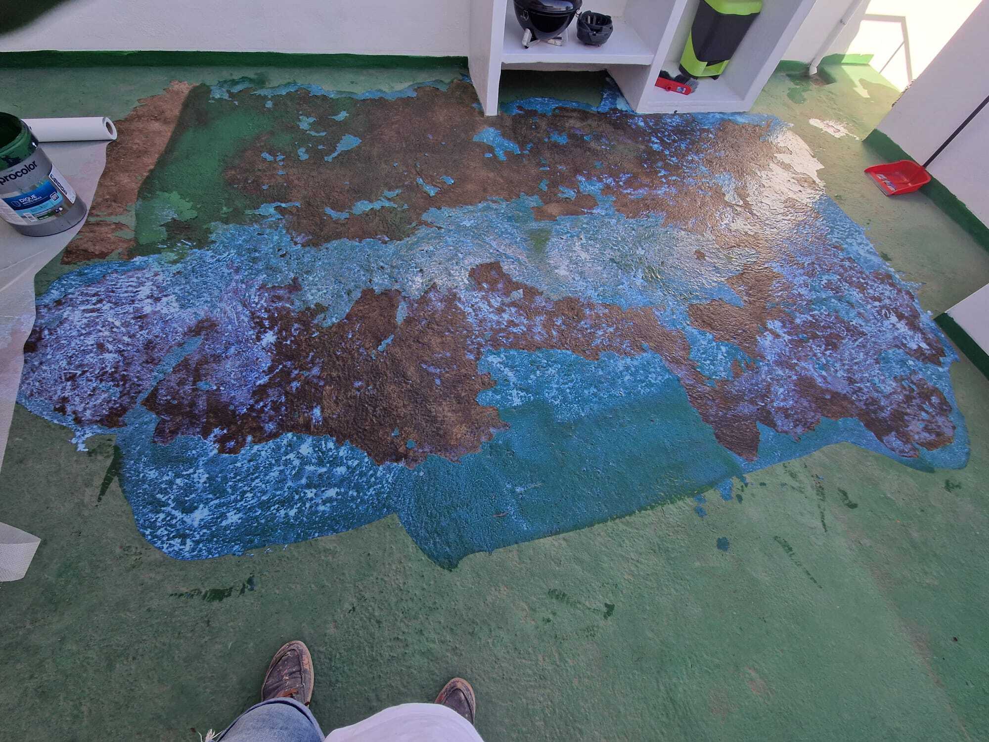 Nuestra intervención consistió en el raspado exhaustivo y limpieza de la superficie, a continuación se aplicó un fondo Procolor Acrifix.