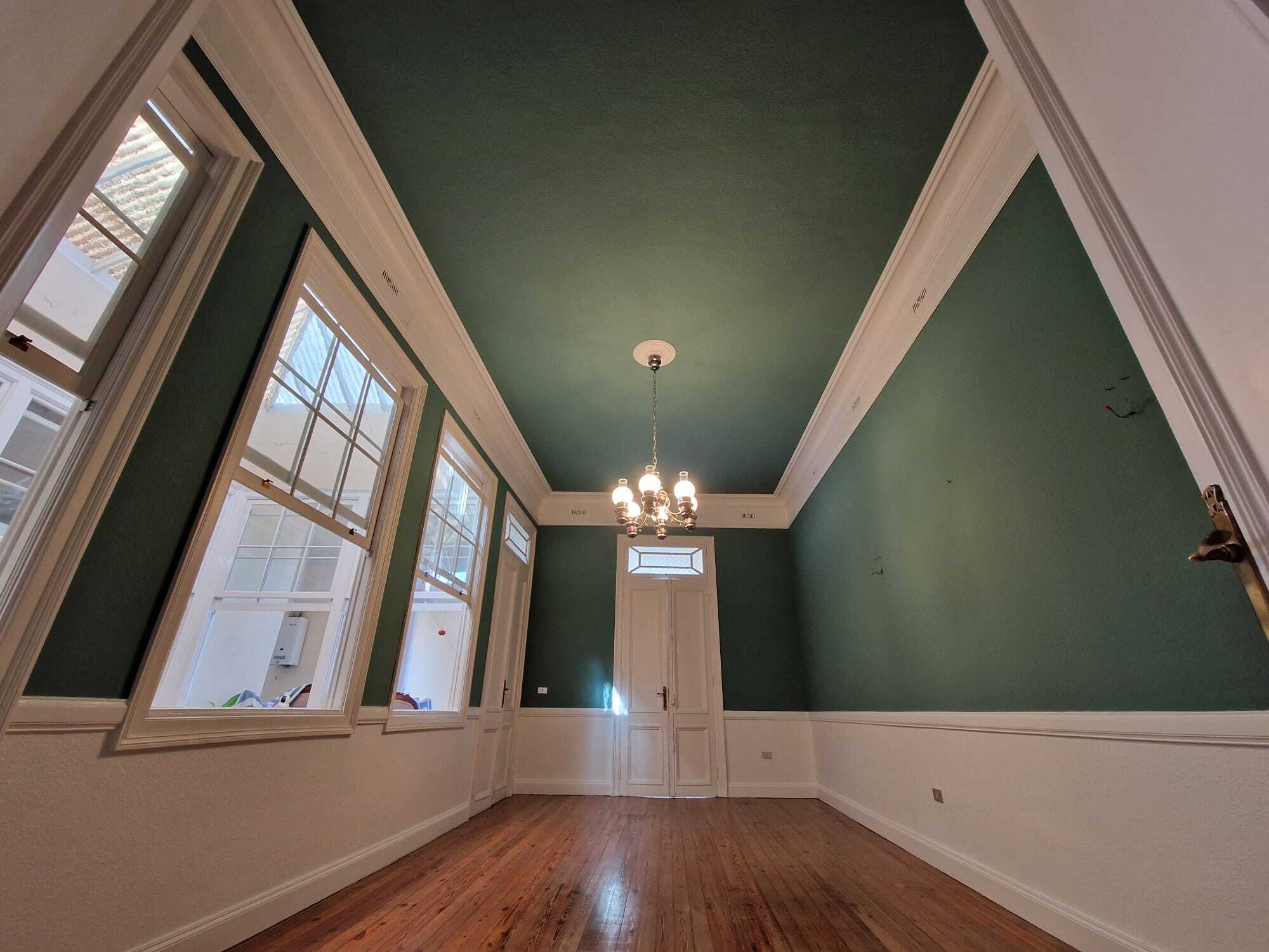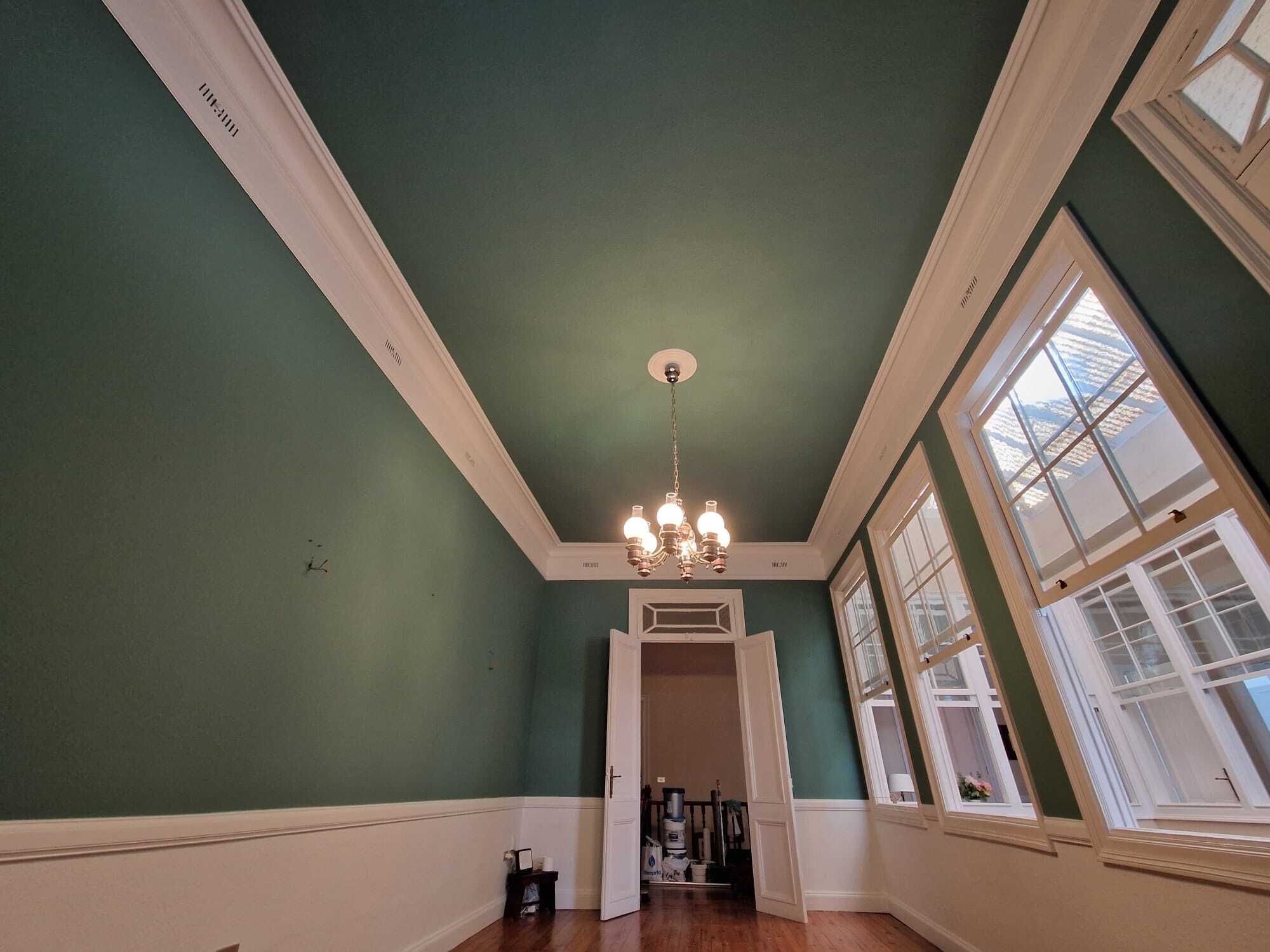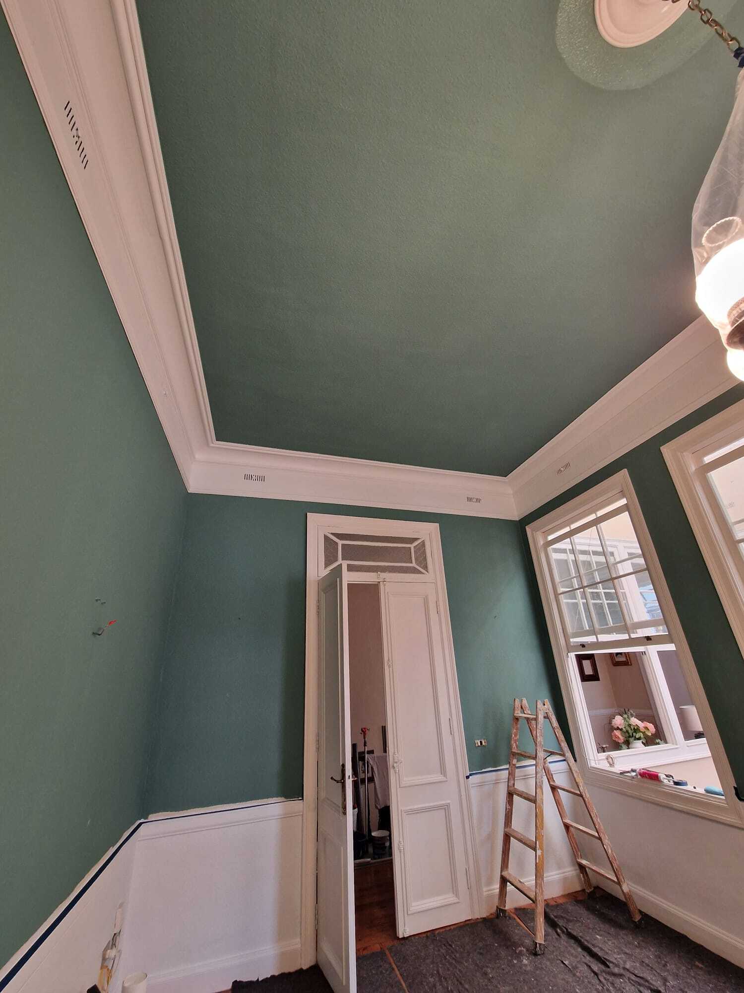 Nuestra intervención consistió en la limpieza de superficie, a continuación se resano la superficie de micro fisuras y golpes. Y para finalizar se aplicó 2 Capas de pintura Procolor Sideral 390 Color Verde y se esmaltó con Procolor Acritec blanco mate la zona de cornisas.