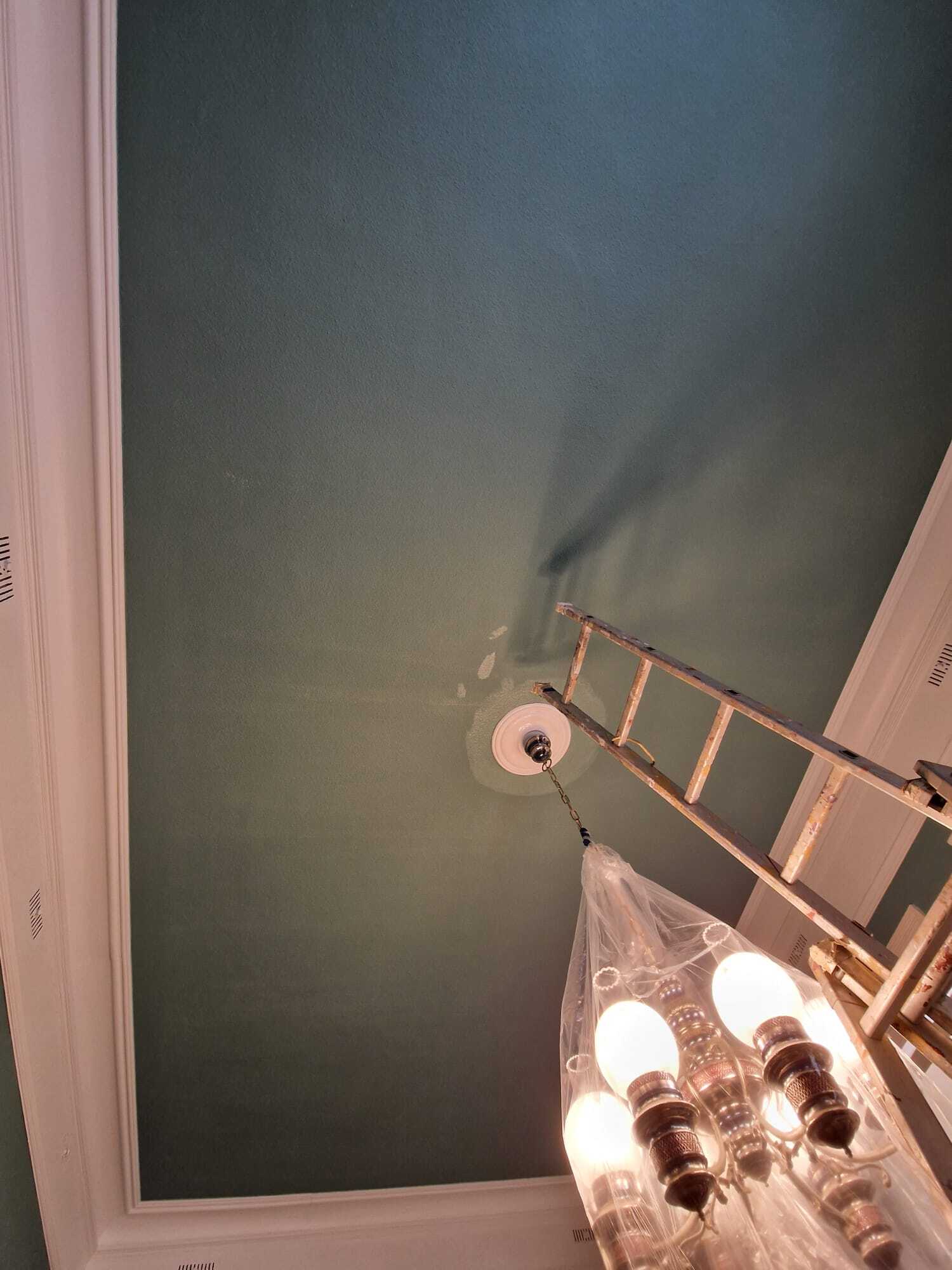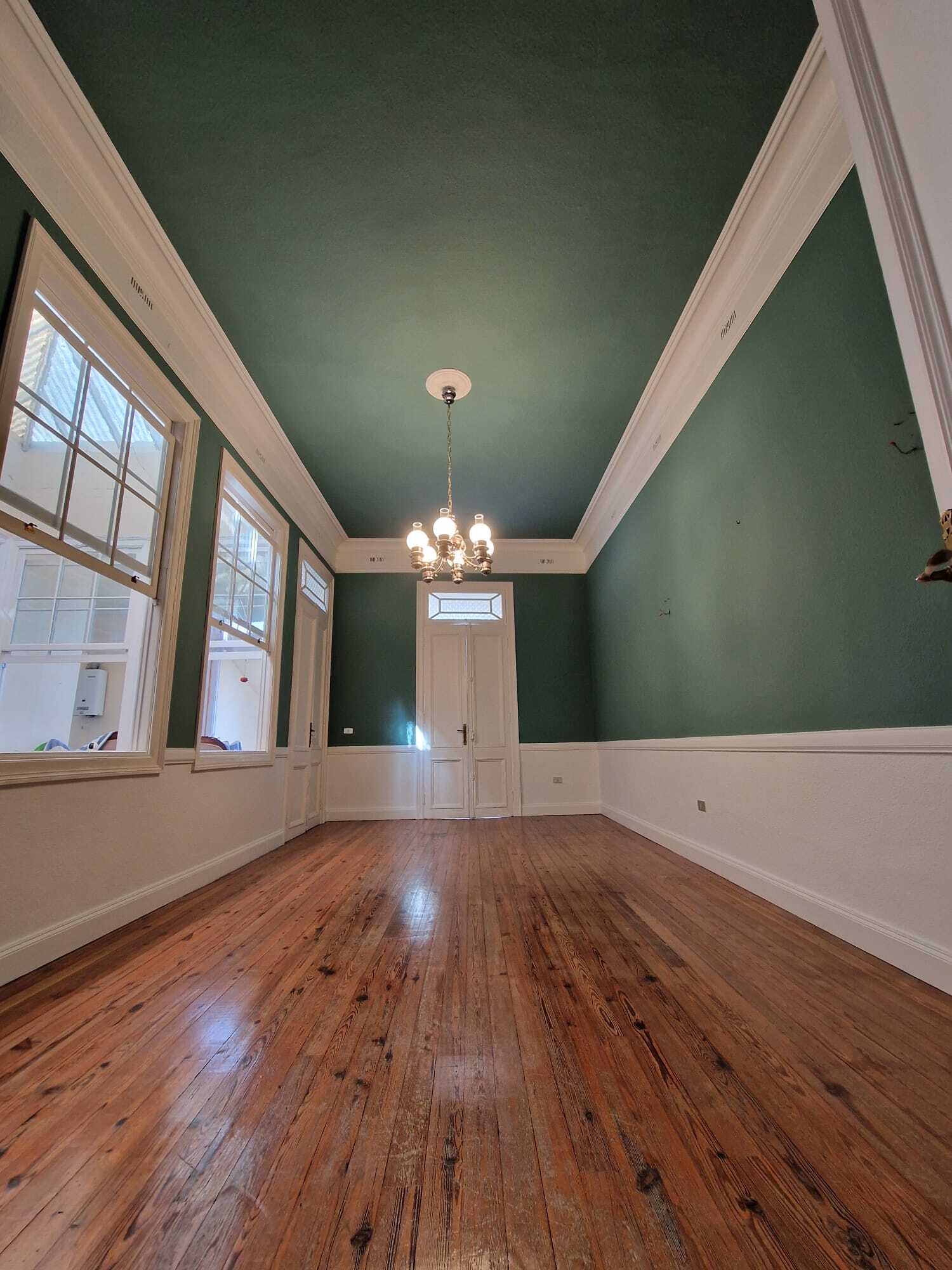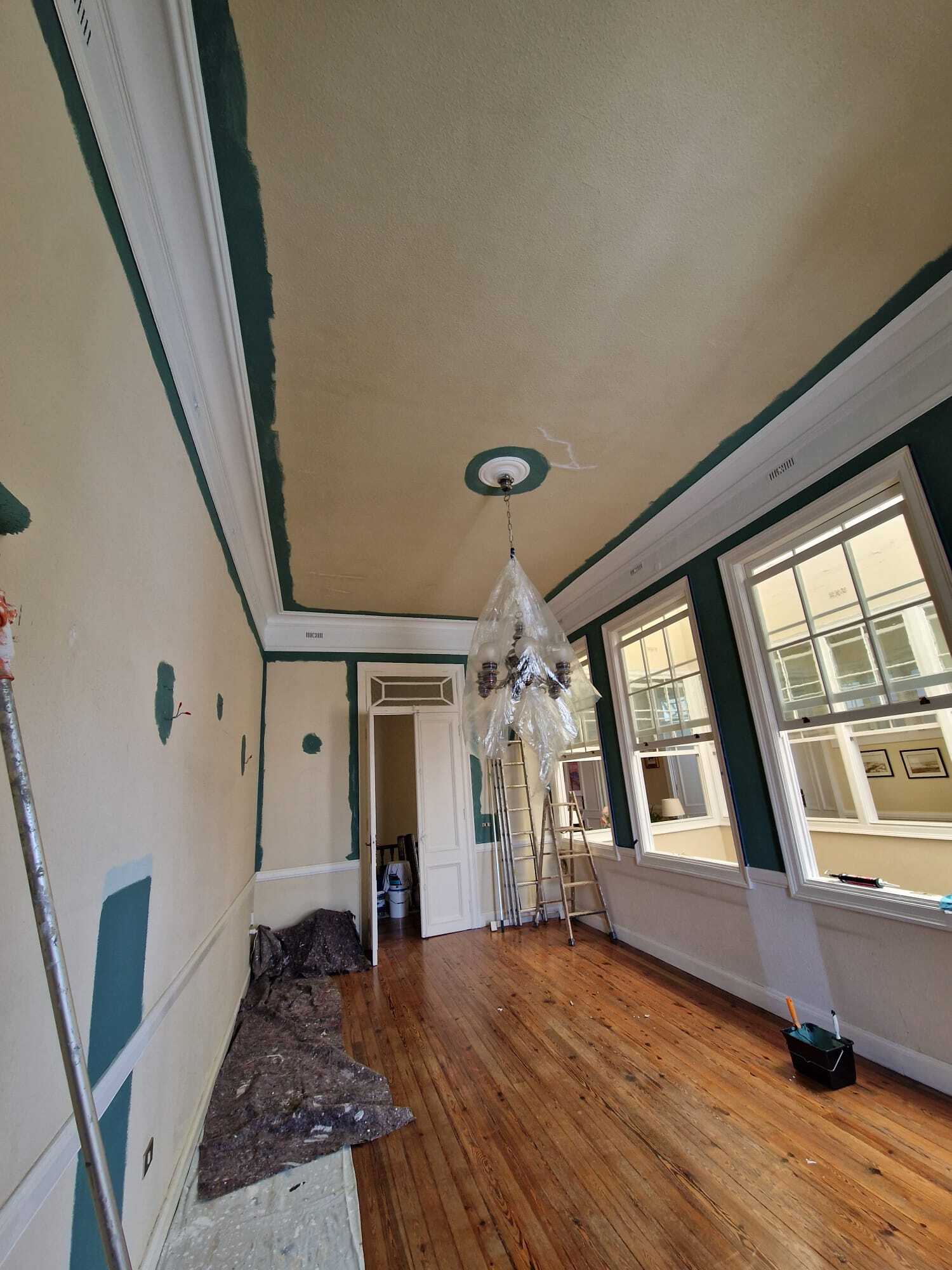 Nuestra intervención consistió en la limpieza de superficie, a continuación se resano la superficie de micro fisuras y golpes. Y para finalizar se aplicó 2 Capas de pintura Procolor Sideral 390 Color Verde y se esmaltó con Procolor Acritec blanco mate la zona de cornisas.