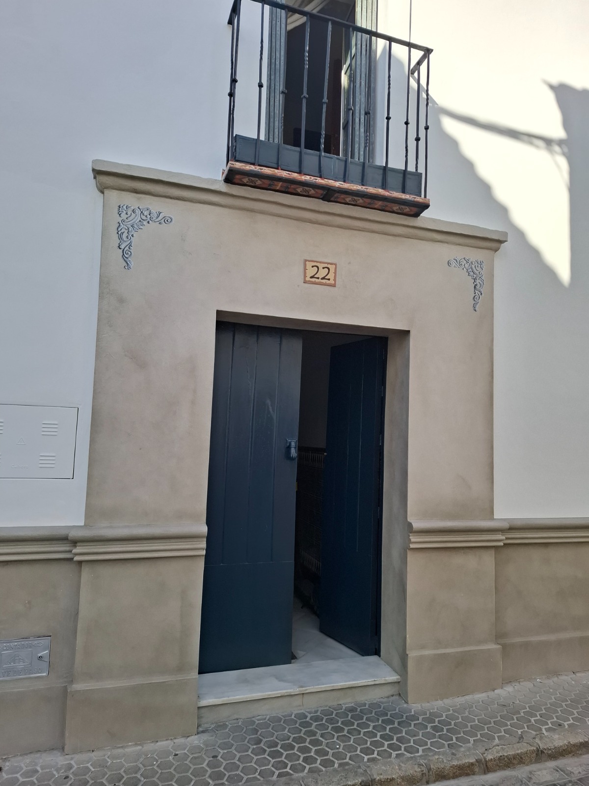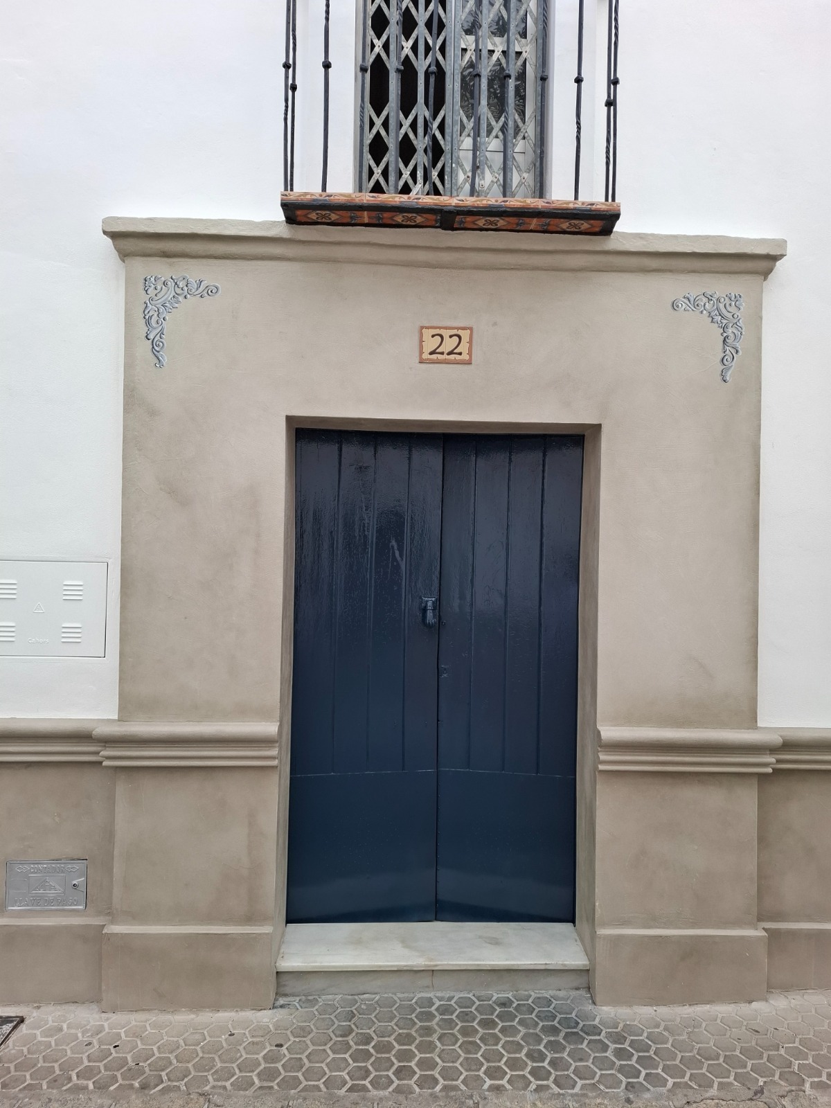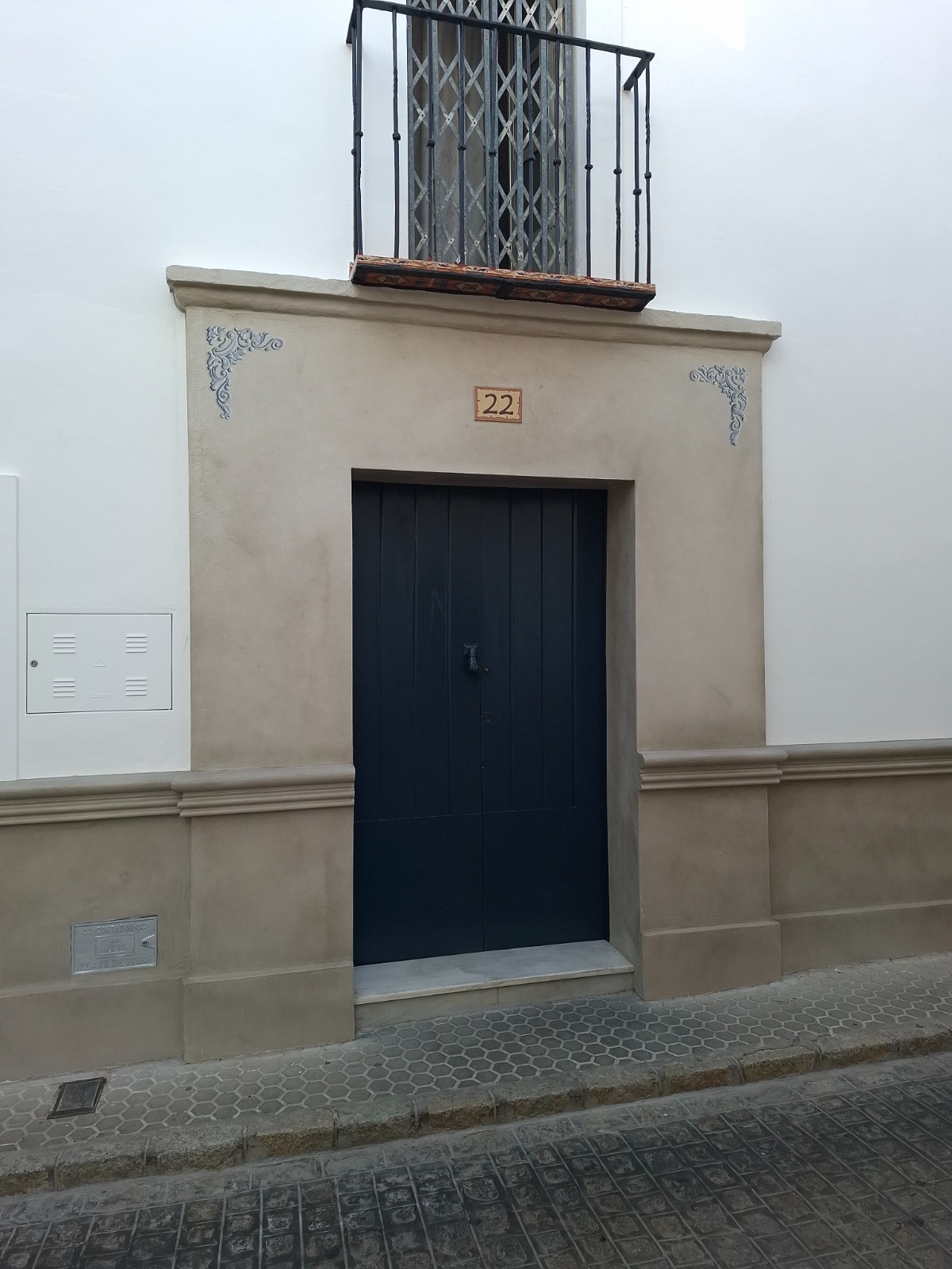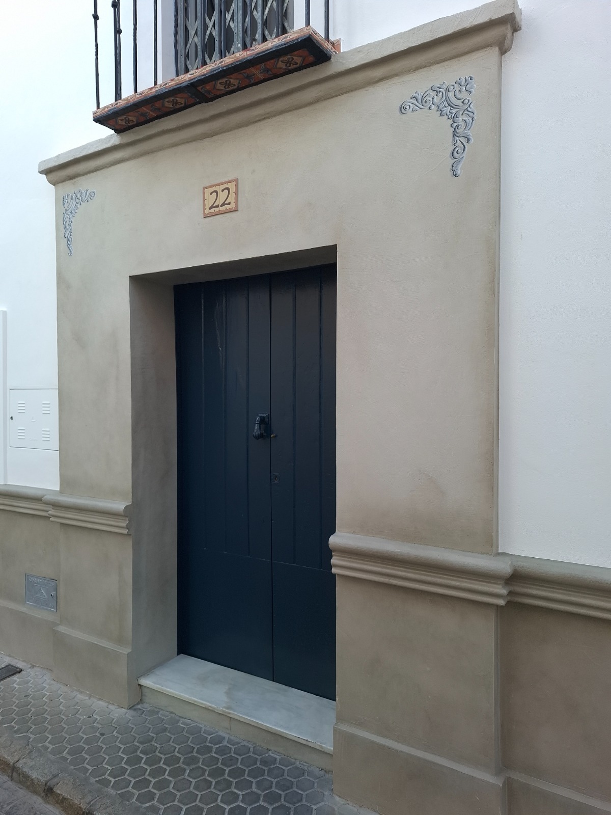 5- Aplicación de mortero de cal Alhíja en zócalo y mocheta entrada para posteriormente proteger y envejecer mediante barniz acrílico satinado tinte Procobar.